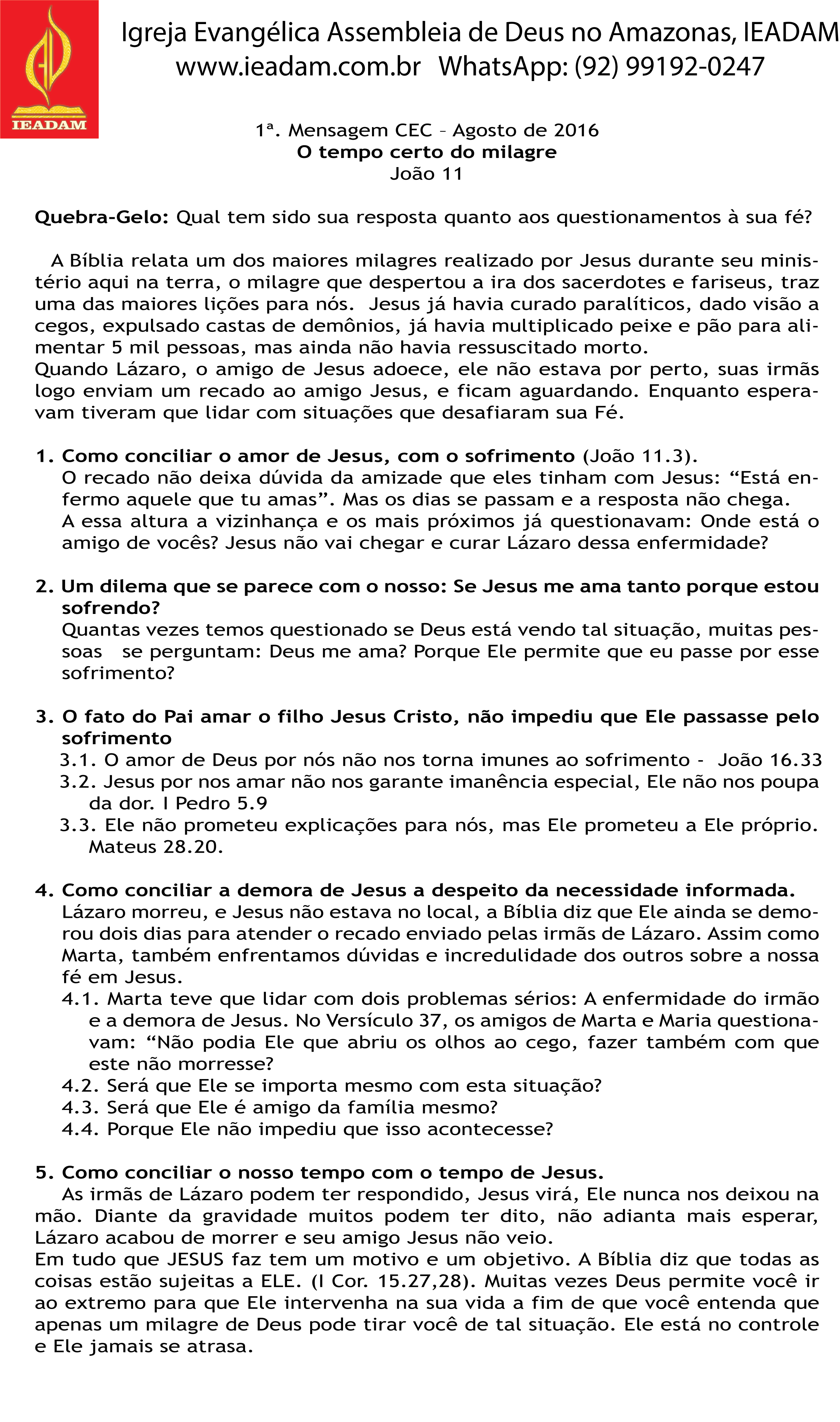 Em tudo que JESUS faz tem um motivo e um objetivo. A Bíblia diz que todas as coisas estão sujeitas a ELE. (I Cor. 15.27,28). Muitas vezes Deus permite você ir ao extremo para que Ele intervenha na sua vida a fim de que você entenda que apenas um milagre de Deus pode tirar você de tal situação. Ele está no controle e Ele jamais se atrasa.