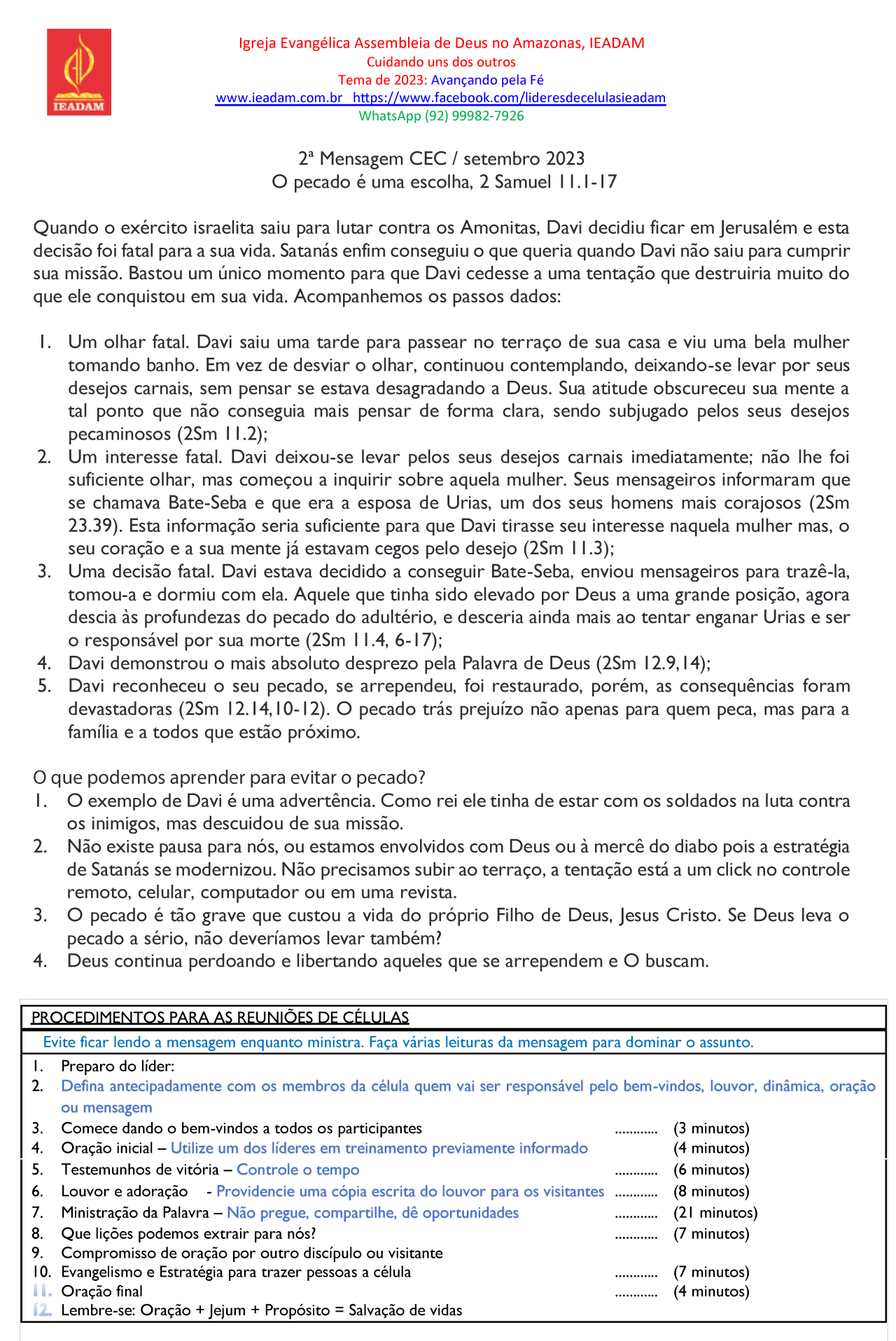 1. O exemplo de Davi é uma advertência. Como rei ele tinha de estar com os soldados na luta contra os inimigos, mas descuidou de sua missão.