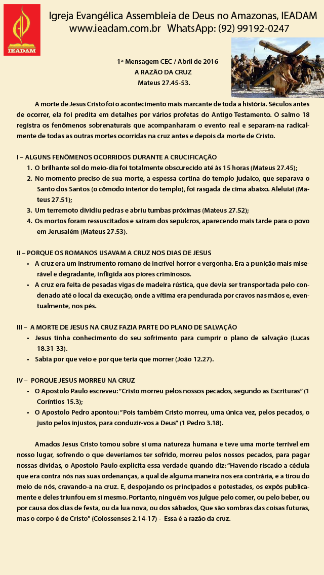 Amados Jesus Cristo tomou sobre si uma natureza humana e teve uma morte terrível em nosso lugar, sofrendo o que deveríamos ter sofrido, morreu pelos nossos pecados, para pagar nossas dividas, o Apostolo Paulo explicita essa verdade quando diz: “Havendo riscado a cédula que era contra nós nas suas ordenanças, a qual de alguma maneira nos era contrária, e a tirou do meio de nós, cravando-a na cruz. E, despojando os principados e potestades, os expôs publicamente e deles triunfou em si mesmo. Portanto, ninguém vos julgue pelo comer, ou pelo beber, ou por causa dos dias de festa, ou da lua nova, ou dos sábados, Que são sombras das coisas futuras, mas o corpo é de Cristo” (Colossenses 2.14-17) – Essa é a razão da cruz.