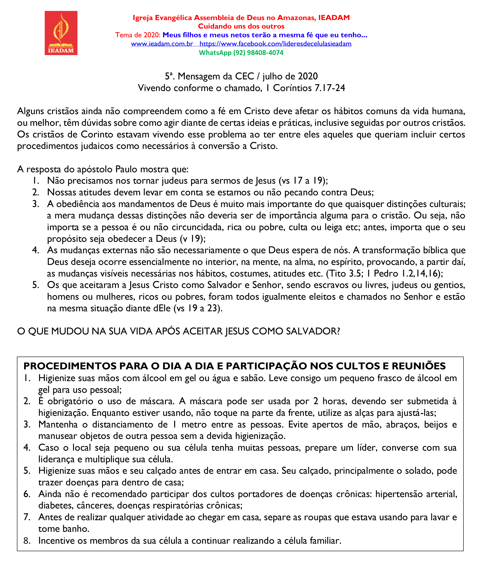 5. Os que aceitaram a Jesus Cristo como Salvador e Senhor, sendo escravos ou livres, judeus ou gentios, homens ou mulheres, ricos ou pobres, foram todos igualmente eleitos e chamados no Senhor e estão na mesma situação diante dEle (vs 19 a 23).
