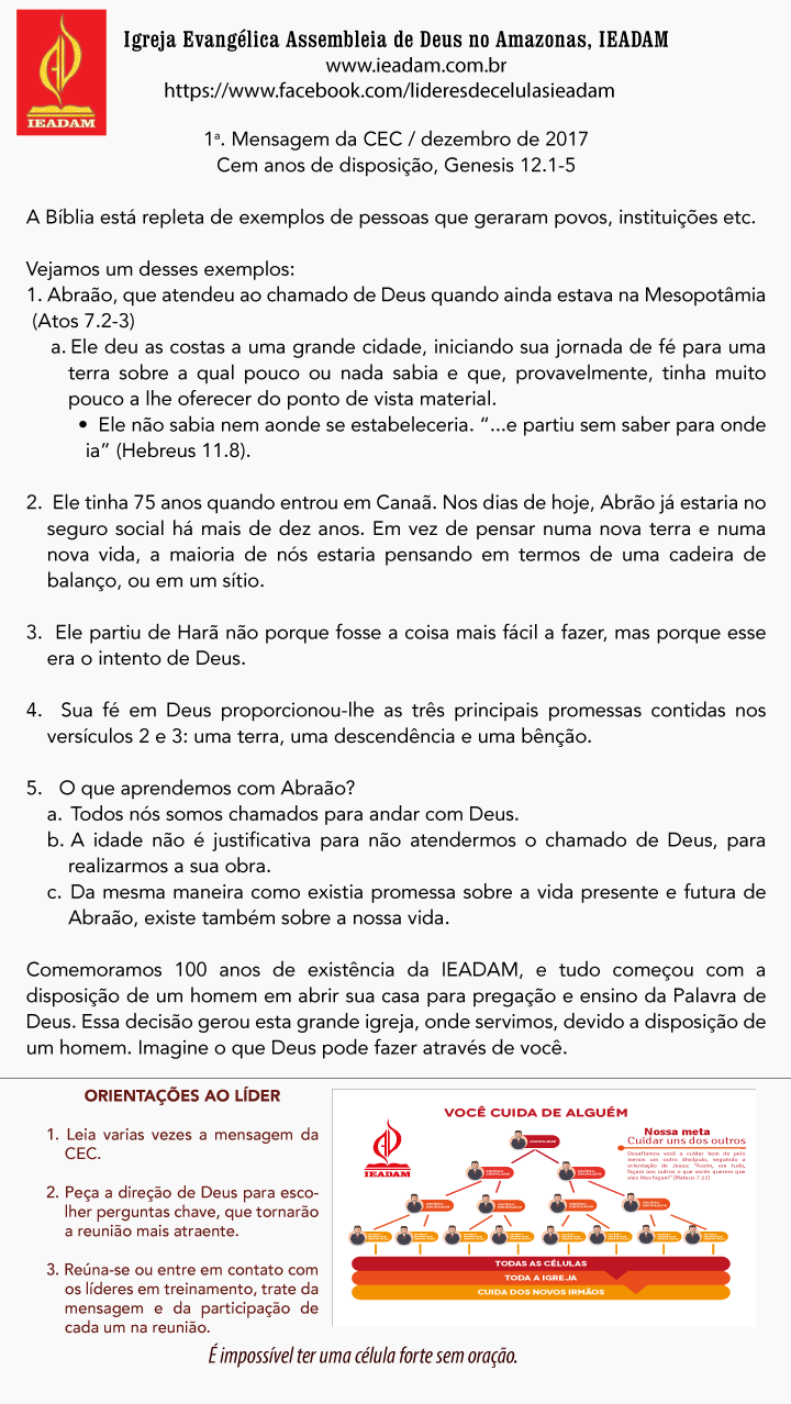 Comemoramos 100 anos de existência da IEADAM, e tudo começou com a disposição de um homem em abrir sua casa para pregação e ensino da Palavra de Deus. Essa decisão gerou esta grande igreja, onde servimos, devido a disposição de um homem. Imagine o que Deus pode fazer através de você.