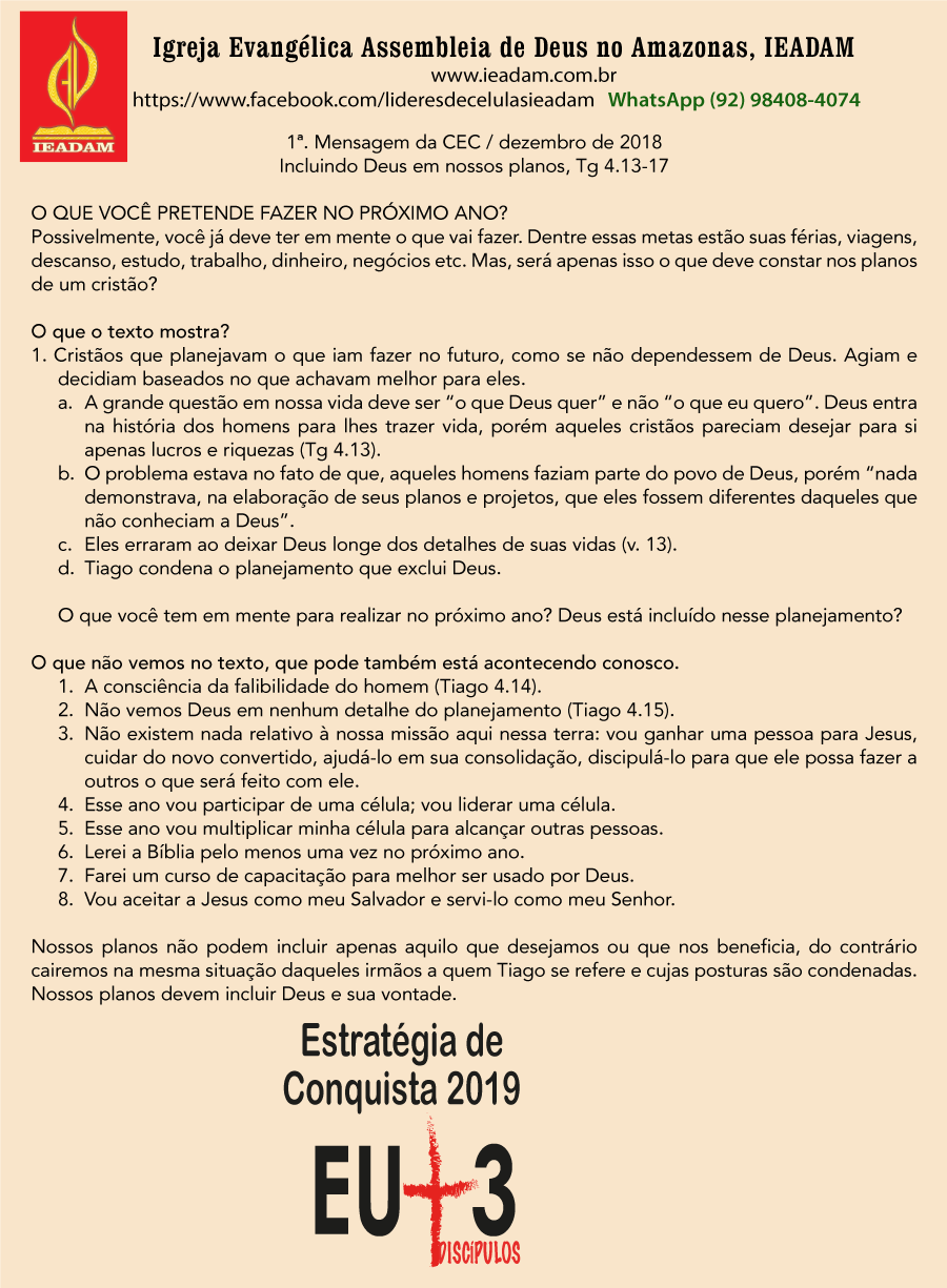 Nossos planos não podem incluir apenas aquilo que desejamos ou que nos beneficia, do contrário cairemos na mesma situação daqueles irmãos a quem Tiago se refere e cujas posturas são condenadas. Nossos planos devem incluir Deus e sua vontade.