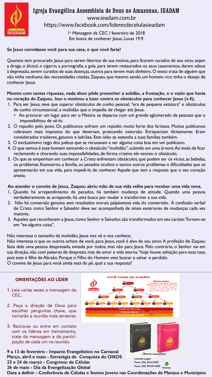 Quantos tem procurado Jesus para serem libertos de sua insônia, para ficarem curados de seu vício, sejam a droga, o álcool, o cigarro, a pornografia, a gula, para terem restaurados os seus casamentos, darem adeus à depressão, serem curados de suas doenças, outros para terem mais dinheiro. O texto trata de alguém que não tinha nenhuma das necessidades citadas, Zaqueu, que mesmo sendo um homem rico tinha o desejo de conhecer Jesus.