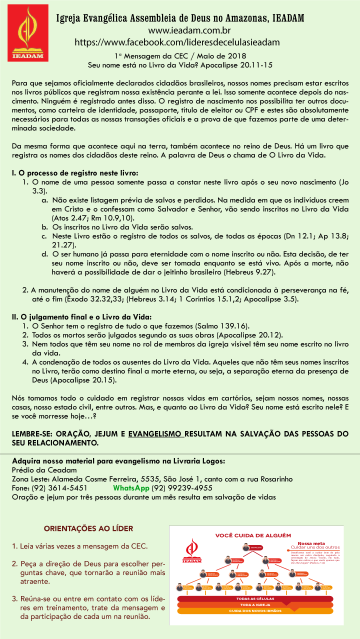 - O ser humano já passa para eternidade com o nome inscrito ou não. Esta decisão, de ter seu nome inscrito ou não, deve ser tomada enquanto se está vivo. Após a morte, não haverá a possibilidade de dar o jeitinho brasileiro (Hebreus 9.27).