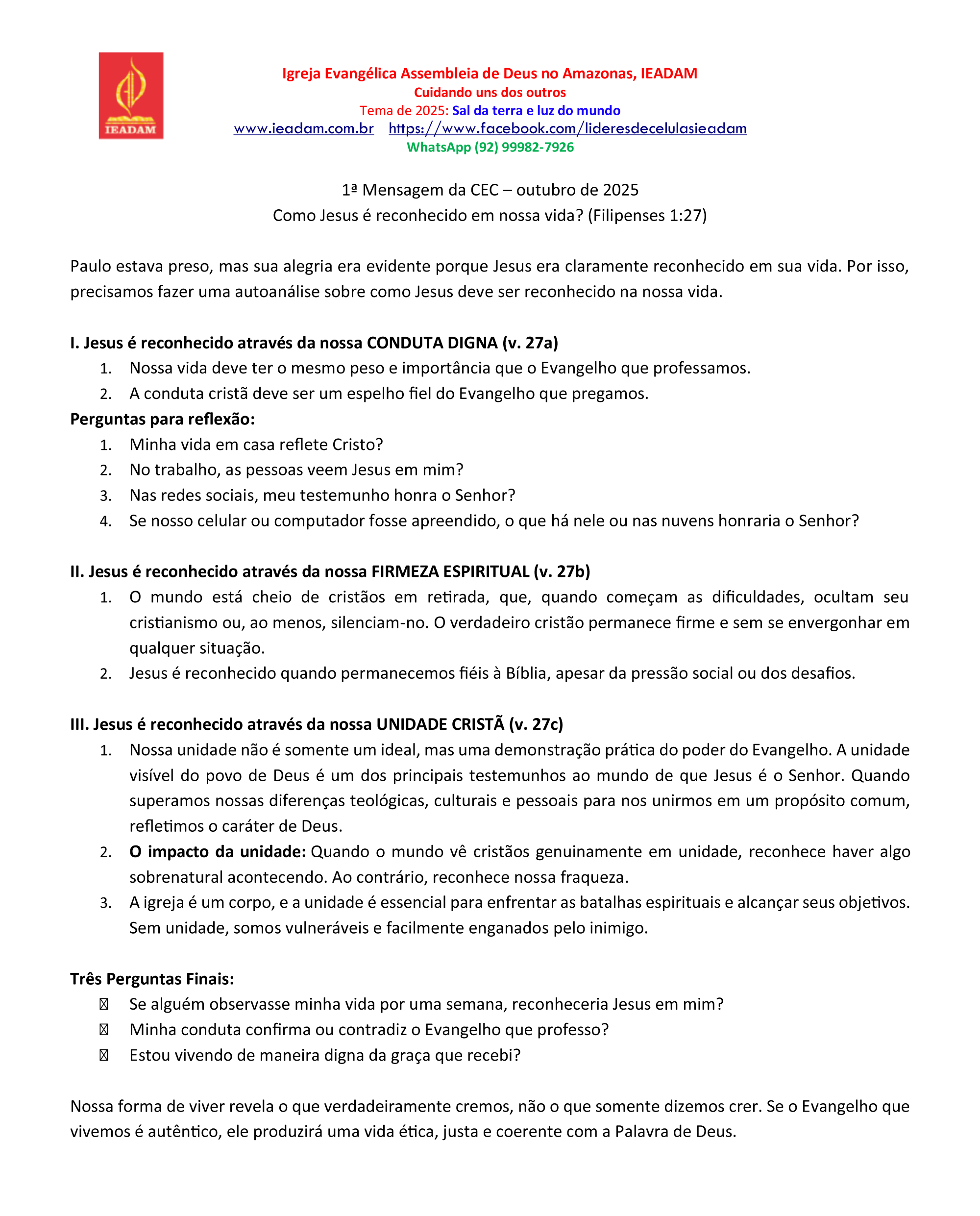 1ª Mensagem da CEC – outubro de 2025 Como Jesus é reconhecido em nossa vida? (Filipenses 1:27)