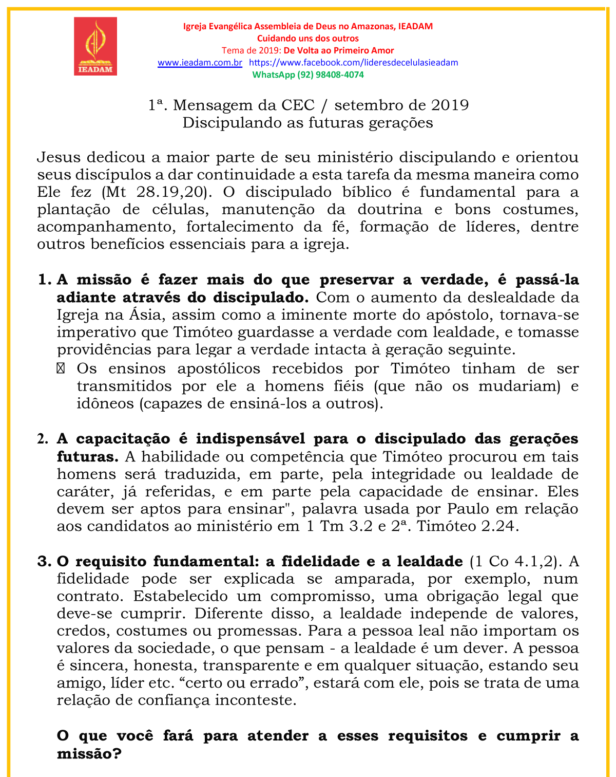 1. A missão é fazer mais do que preservar a verdade, é passá-la adiante através do discipulado. Com o aumento da deslealdade da Igreja na Ásia, assim como a iminente morte do apóstolo, tornava-se imperativo que Timóteo guardasse a verdade com lealdade, e tomasse providências para legar a verdade intacta à geração seguinte.