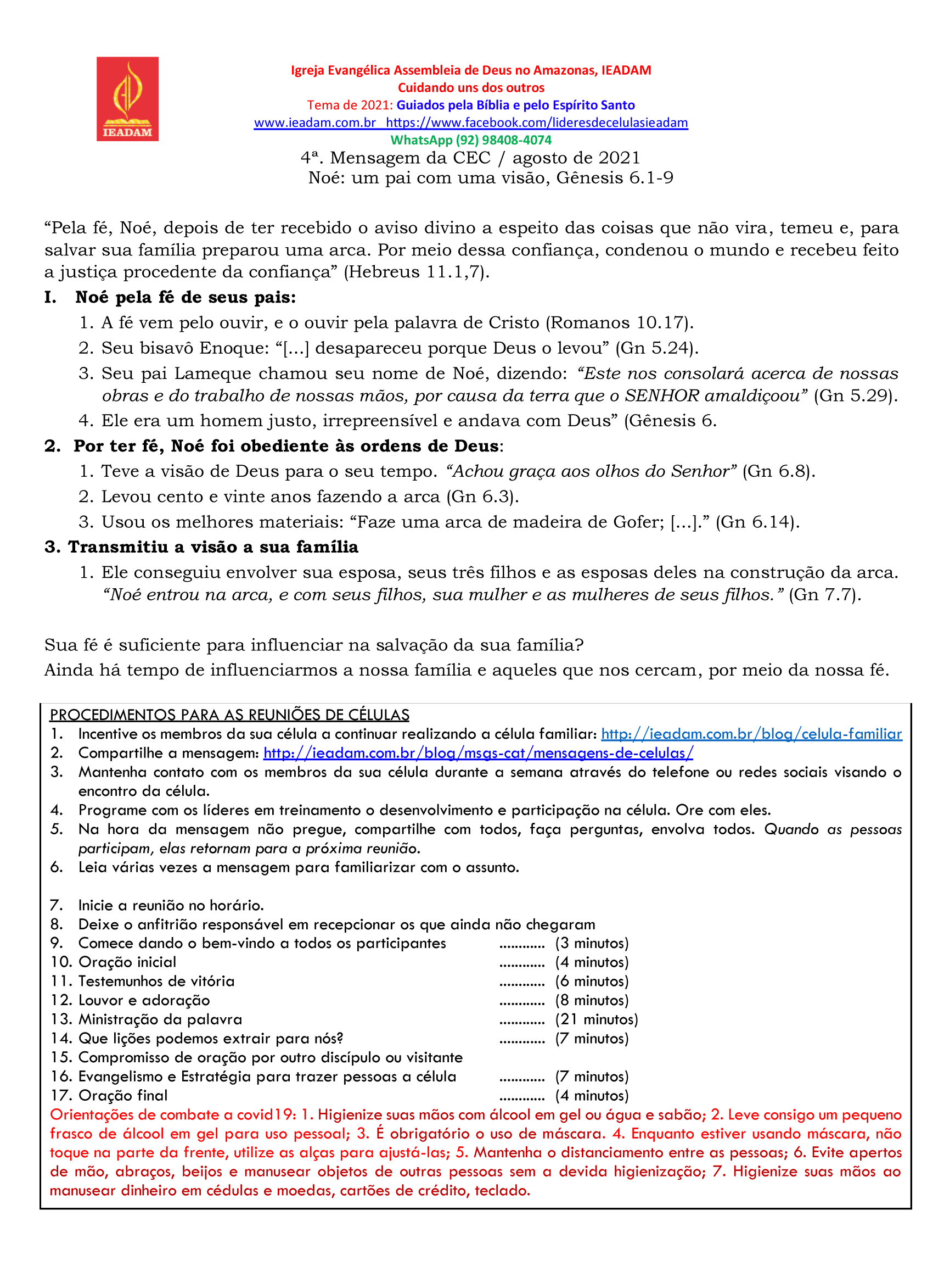 “Pela fé, Noé, depois de ter recebido o aviso divino a espeito das coisas que não vira, temeu e, para salvar sua família preparou uma arca. Por meio dessa confiança, condenou o mundo e recebeu feito a justiça procedente da confiança” (Hebreus 11.1,7).