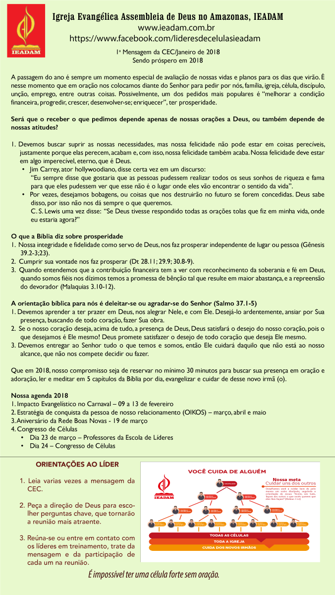Que em 2018, nosso compromisso seja de reservar no mínimo 30 minutos para buscar sua presença em oração e adoração, ler e meditar em 5 capítulos da Bíblia por dia, evangelizar e cuidar de desse novo irmã (o).