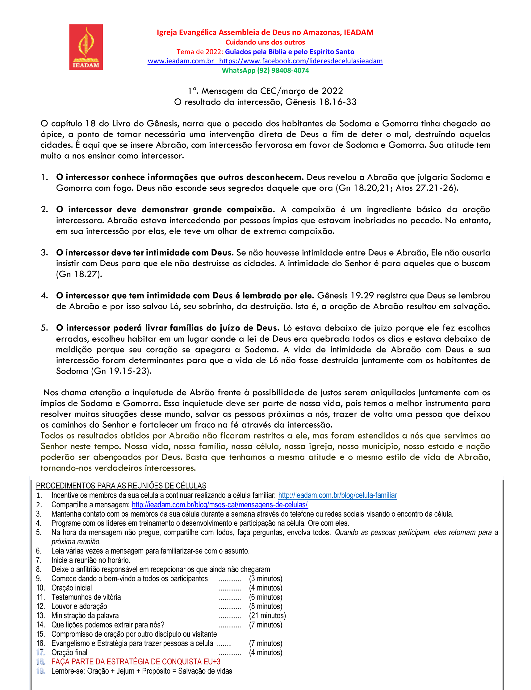 5. O intercessor poderá livrar famílias do juízo de Deus. Ló estava debaixo de juízo porque ele fez escolhas erradas, escolheu habitar em um lugar aonde a lei de Deus era quebrada todos os dias e estava debaixo de maldição porque seu coração se apegara a Sodoma. A vida de intimidade de Abraão com Deus e sua intercessão foram determinantes para que a vida de Ló não fosse destruída juntamente com os habitantes de Sodoma (Gn 19.15-23).