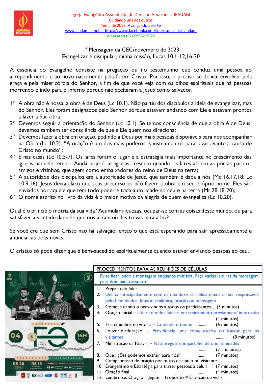 1ª Mensagem da CEC/novembro de 2023 Evangelizar e discipular, minha missão, Lucas 10.1-12,16-20