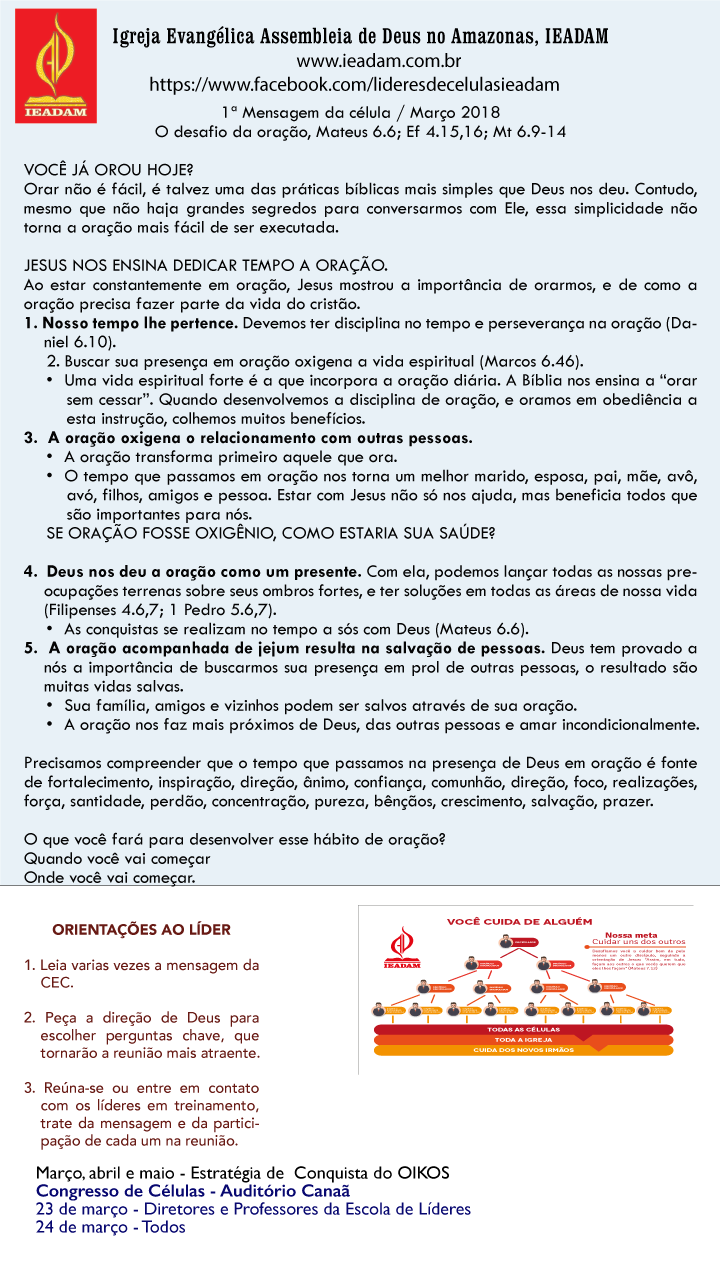 Precisamos compreender que o tempo que passamos na presença de Deus em oração é fonte de fortalecimento, inspiração, direção, ânimo, confiança, comunhão, direção, foco, realizações, força, santidade, perdão, concentração, pureza, bênçãos, crescimento, salvação, prazer.