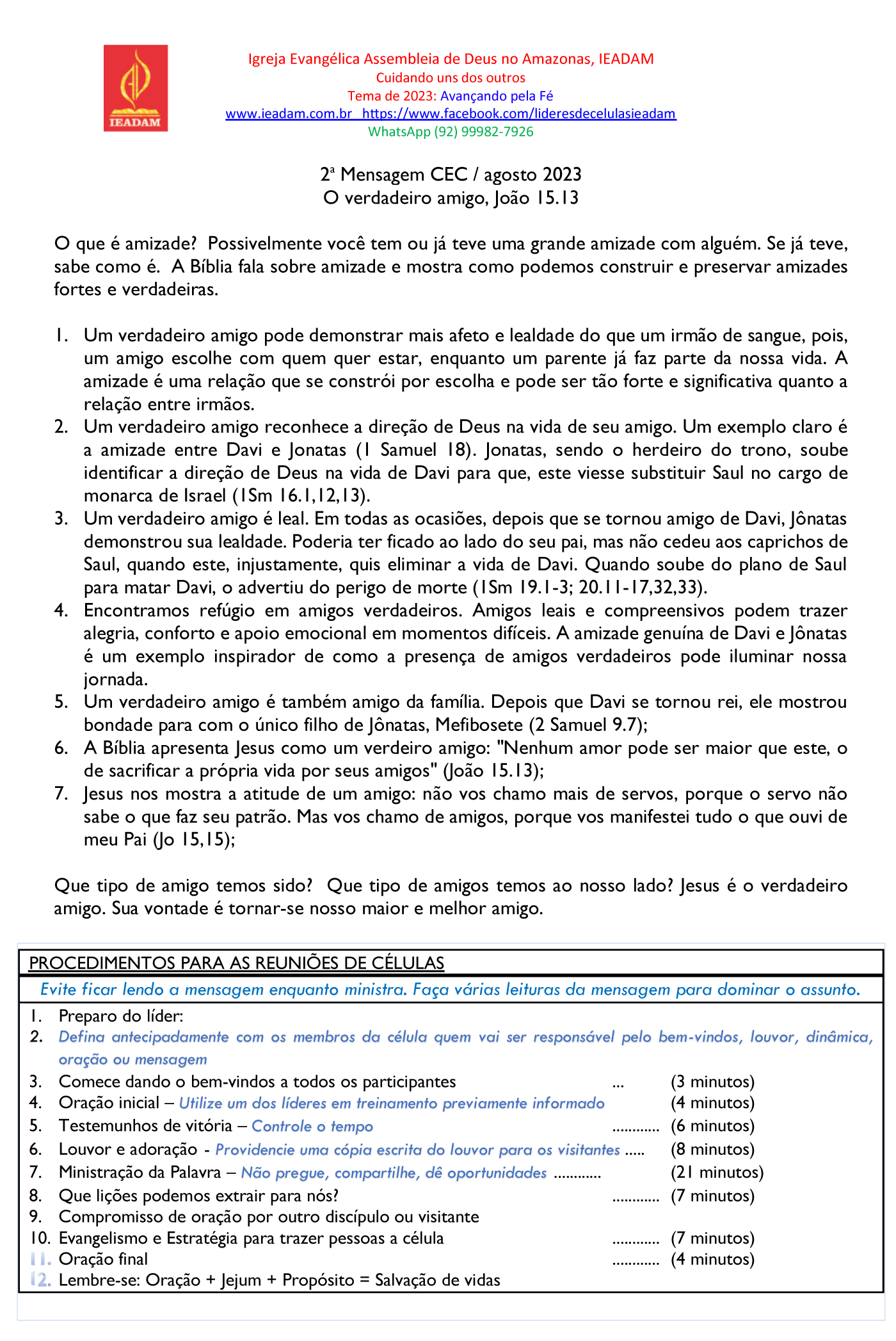 - Um verdadeiro amigo reconhece a direção de Deus na vida de seu amigo. Um exemplo claro é a amizade entre Davi e Jonatas (1 Samuel 18). Jonatas, sendo o herdeiro do trono, soube identificar a direção de Deus na vida de Davi para que, este viesse substituir Saul no cargo de monarca de Israel (1Sm 16.1,12,13).