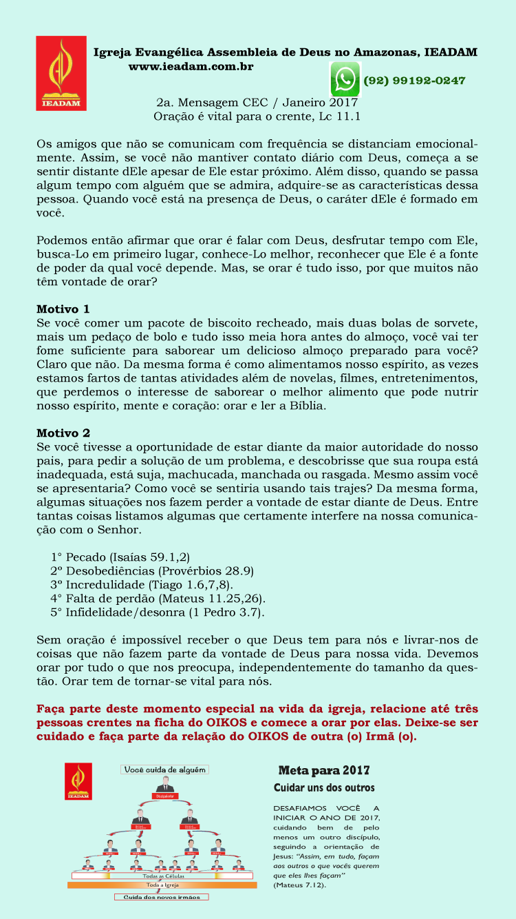 2a. Mensagem CEC / Janeiro 2017 Oração é vital para o crente, Lc 11.1