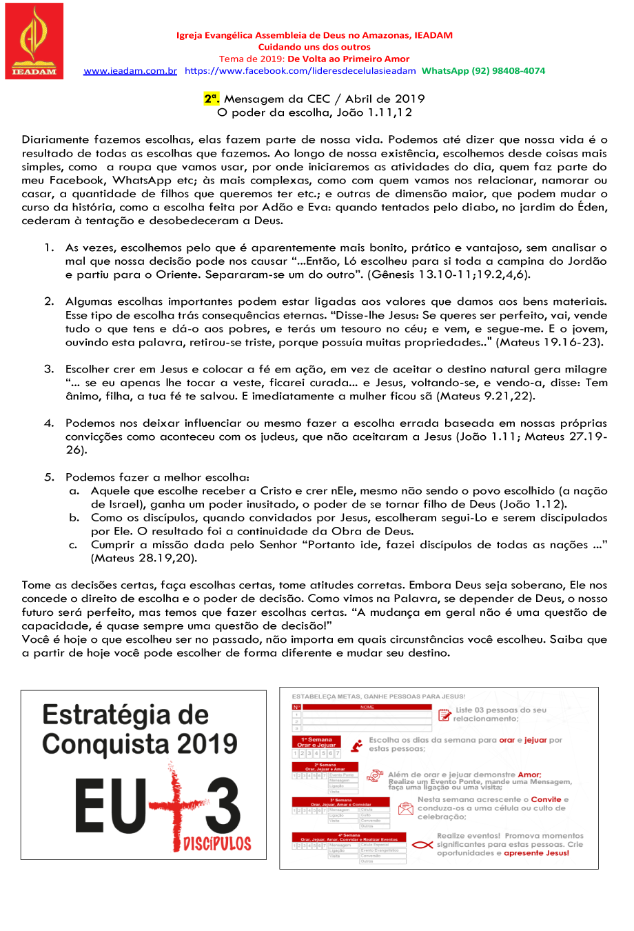 Tome as decisões certas, faça escolhas certas, tome atitudes corretas. Embora Deus seja soberano, Ele nos concede o direito de escolha e o poder de decisão. Como vimos na Palavra, se depender de Deus, o nosso futuro será perfeito, mas temos que fazer escolhas certas. “A mudança em geral não é uma questão de capacidade, é quase sempre uma questão de decisão!”