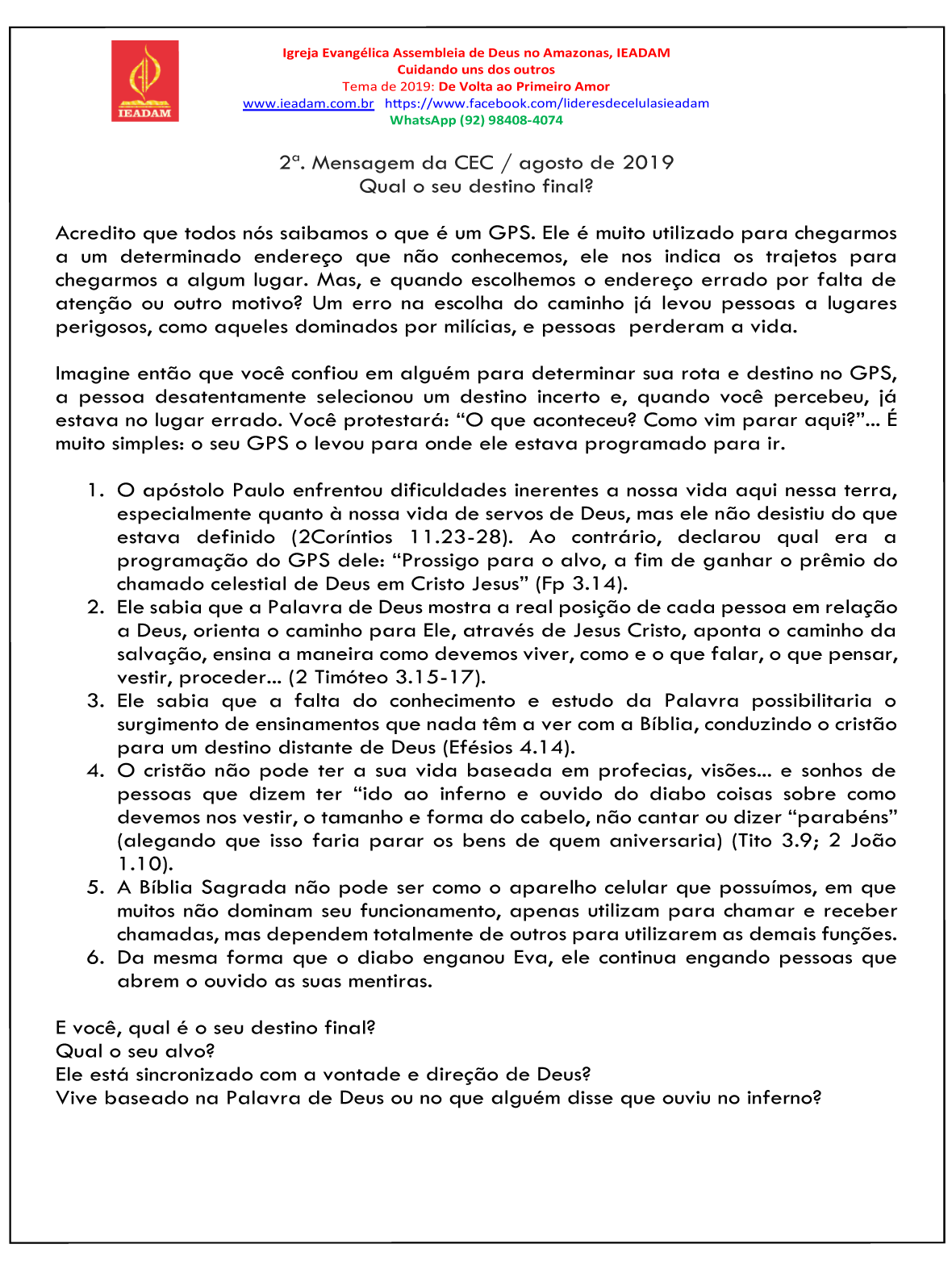 2ª. Mensagem da CEC / agosto de 2019 Qual o seu destino final?