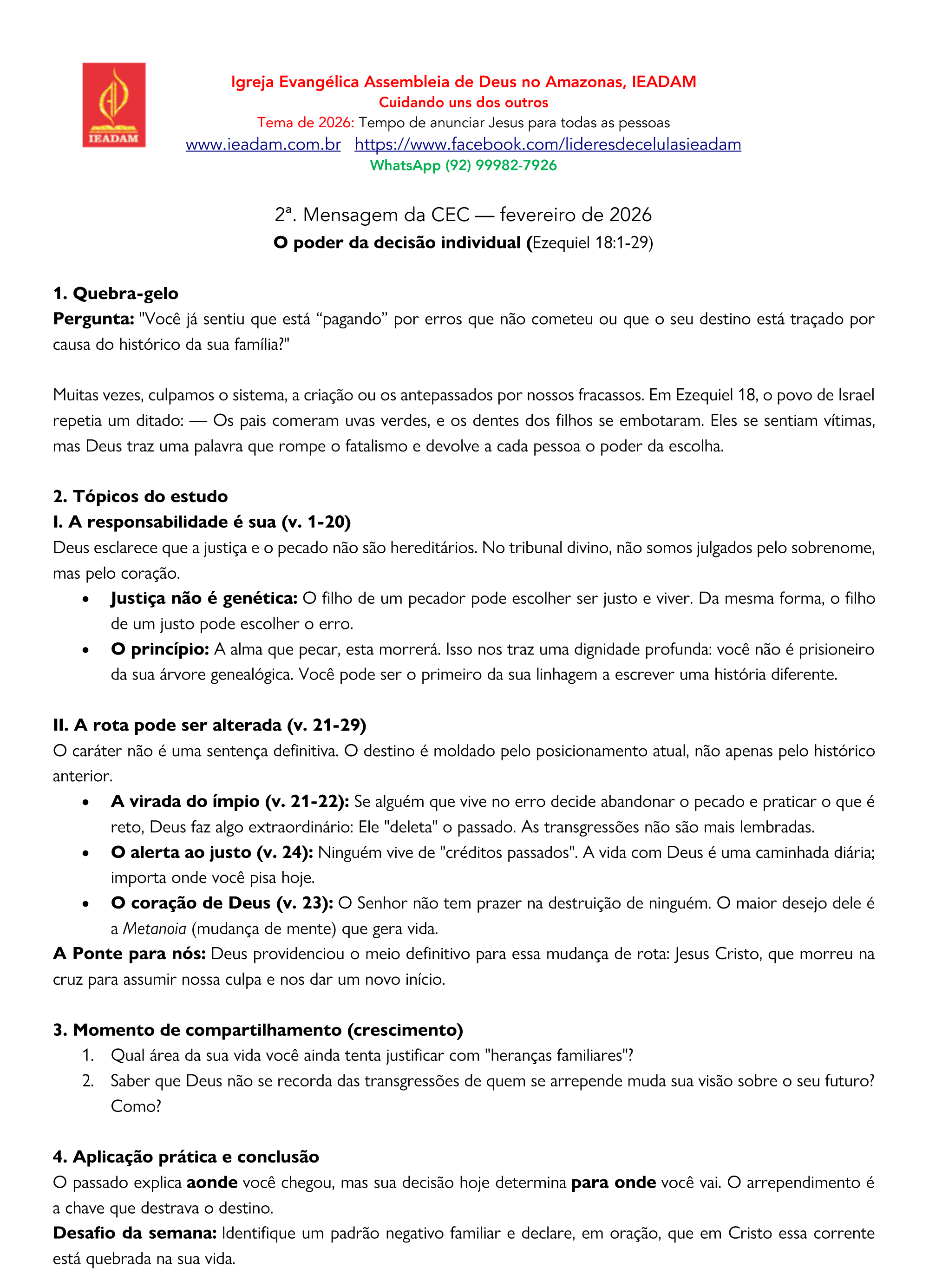 Muitas vezes, culpamos o sistema, a criação ou os antepassados por nossos fracassos. Em Ezequiel 18, o povo de Israel repetia um ditado: — Os pais comeram uvas verdes, e os dentes dos filhos se embotaram. Eles se sentiam vítimas, mas Deus traz uma palavra que rompe o fatalismo e devolve a cada pessoa o poder da escolha.