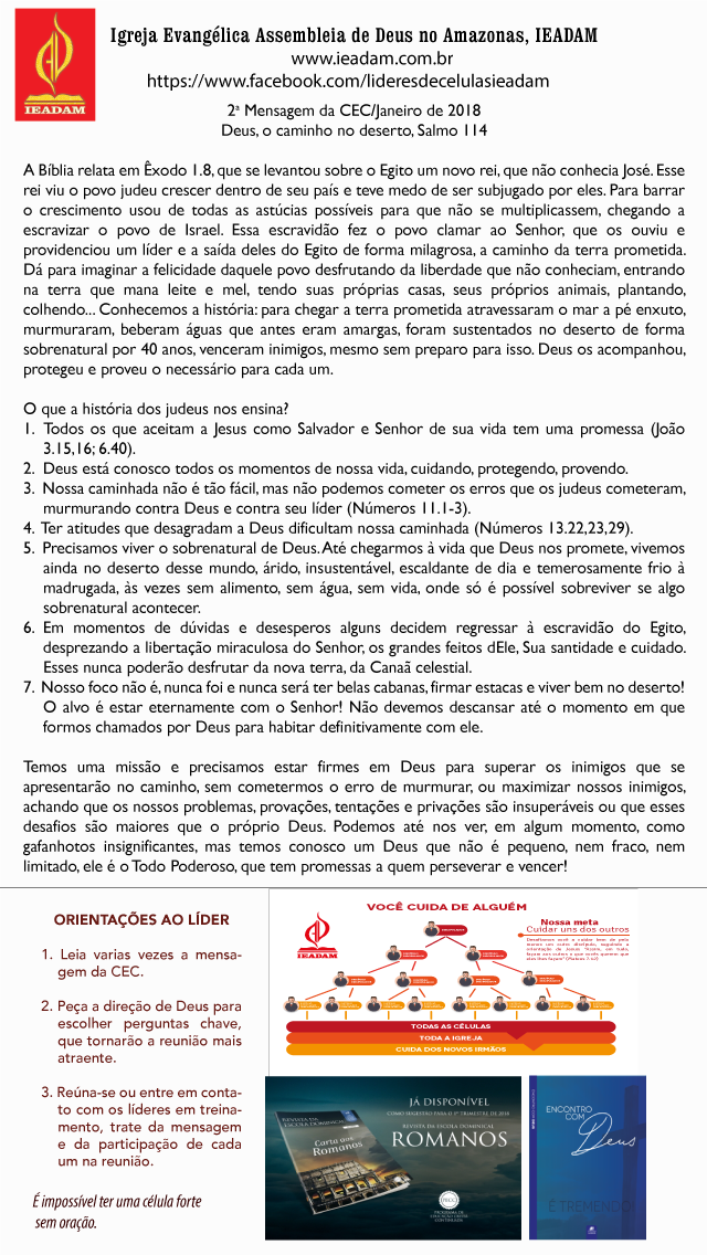- Nossa caminhada não é tão fácil, mas não podemos cometer os erros que os judeus cometeram, murmurando contra Deus e contra seu líder (Nm 11.1-3).