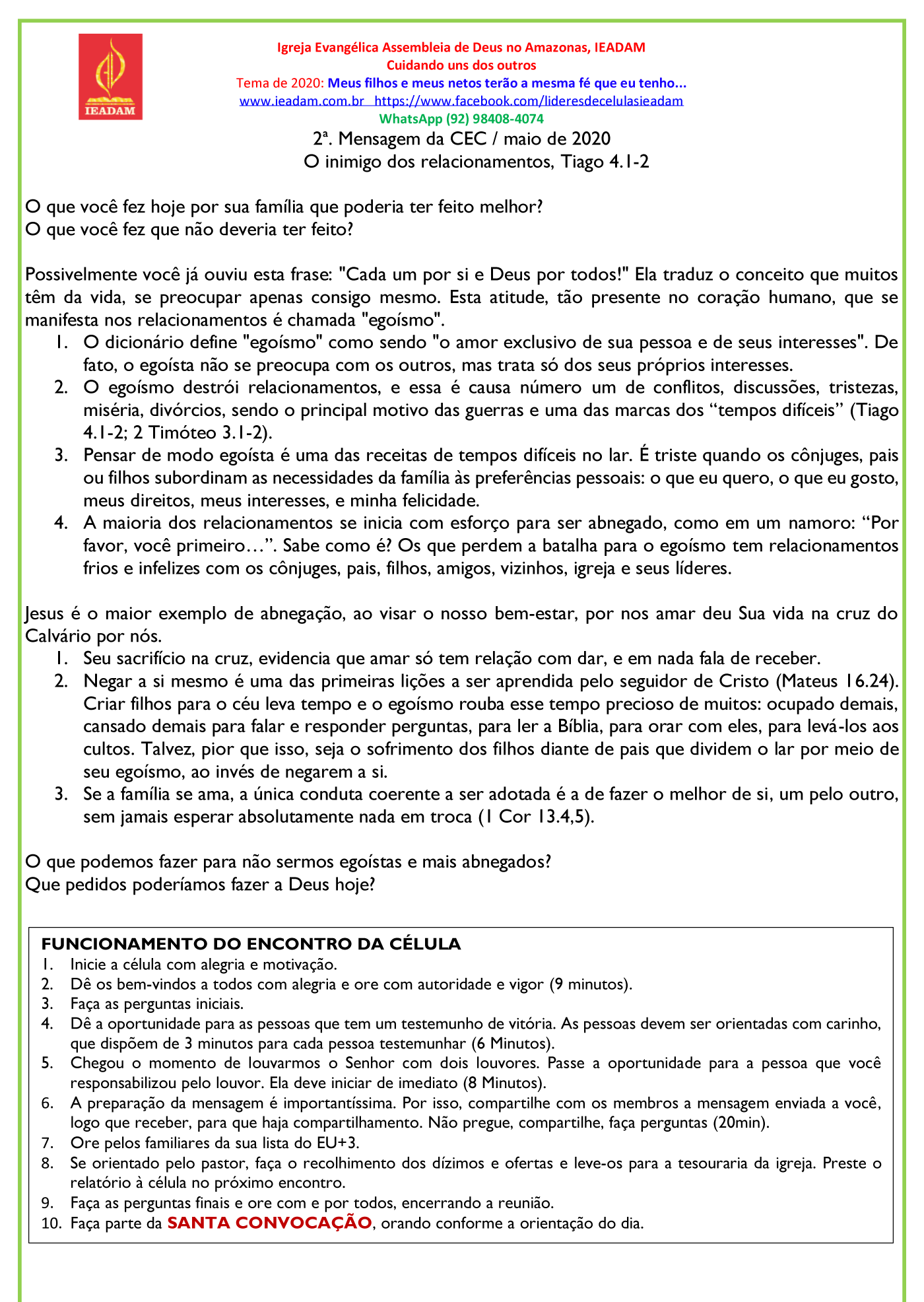 6. A preparação da mensagem é importantíssima. Por isso, compartilhe com os membros a mensagem enviada a você, logo que receber, para que haja compartilhamento. Não pregue, compartilhe, faça perguntas (20min).
