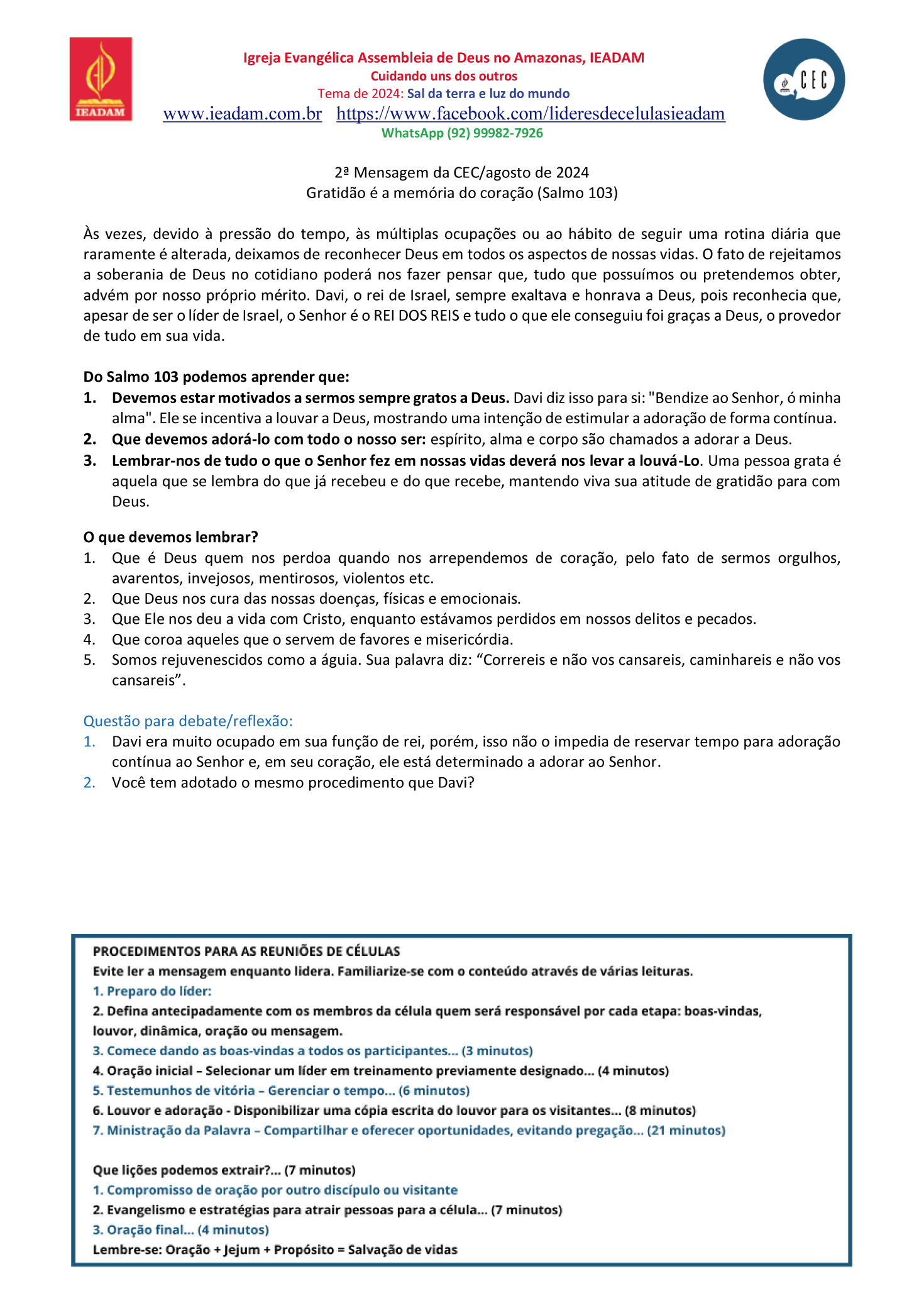 2ª Mensagem da CEC/agosto de 2024 Gratidão é a memória do coração (Salmo 103)