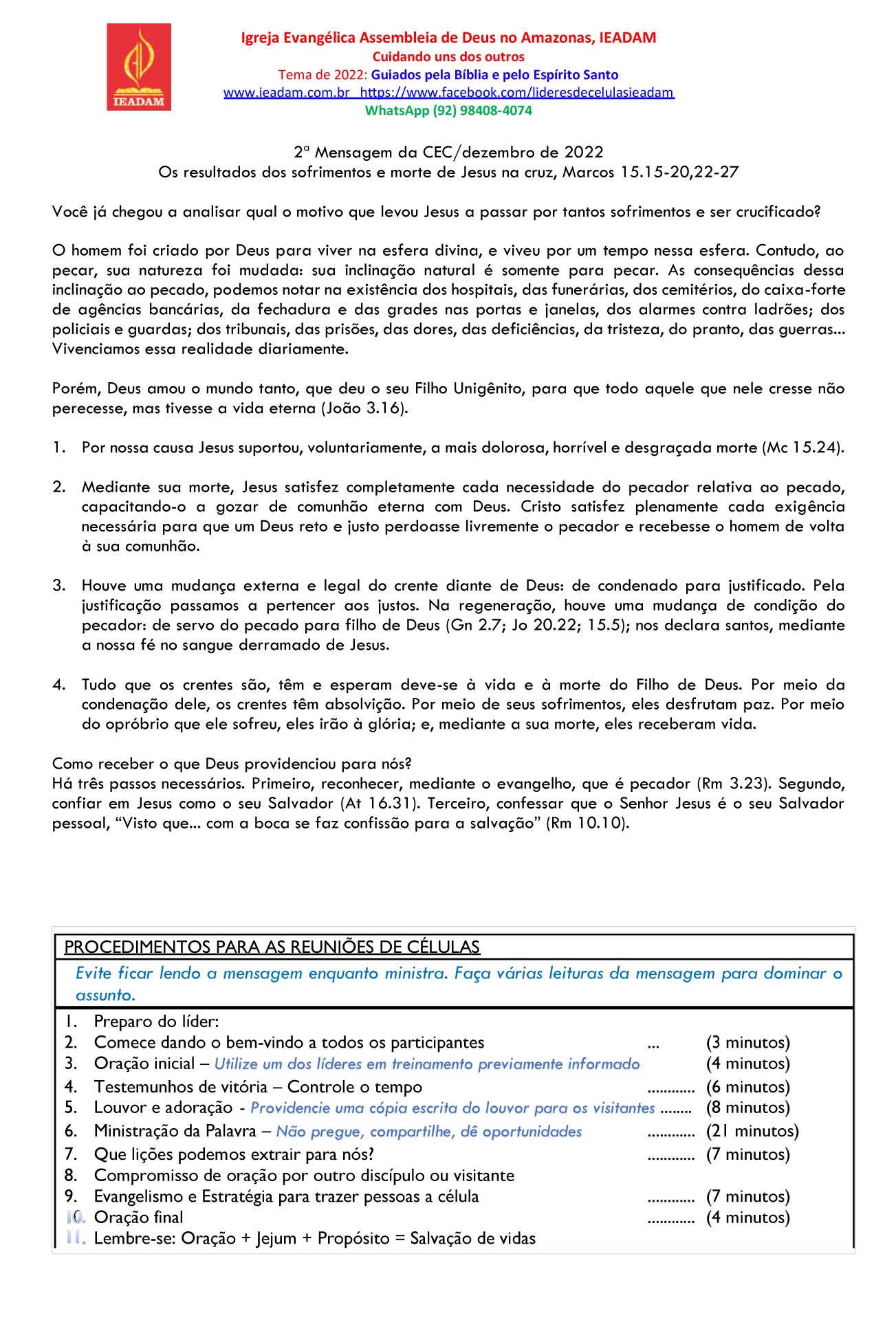 2ª Mensagem da CEC/dezembro de 2022 Os resultados dos sofrimentos e morte de Jesus na cruz, Marcos 15.15-20,22-27