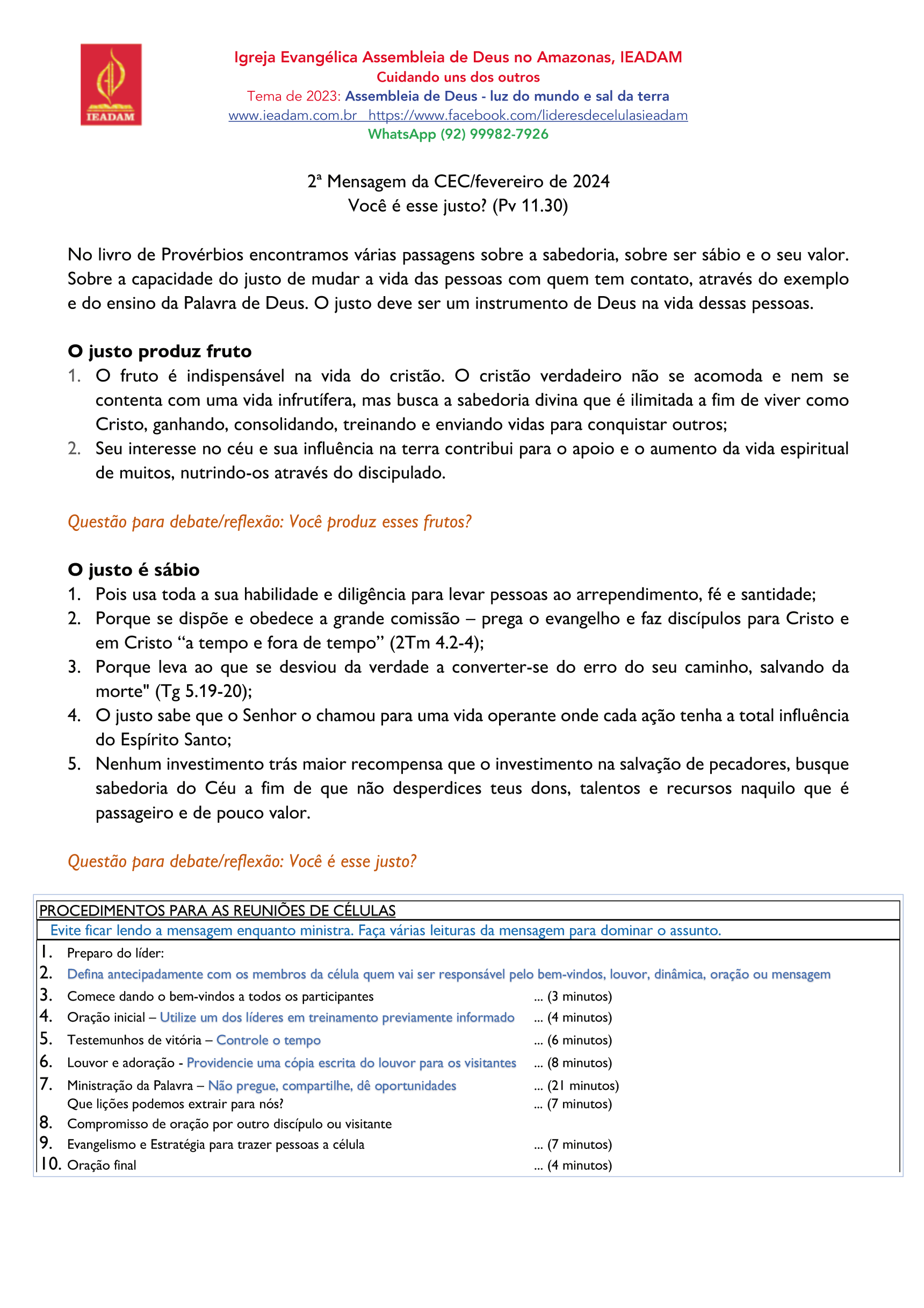 2ª Mensagem da CEC/fevereiro de 2024 Você é esse justo? (Pv 11.30)