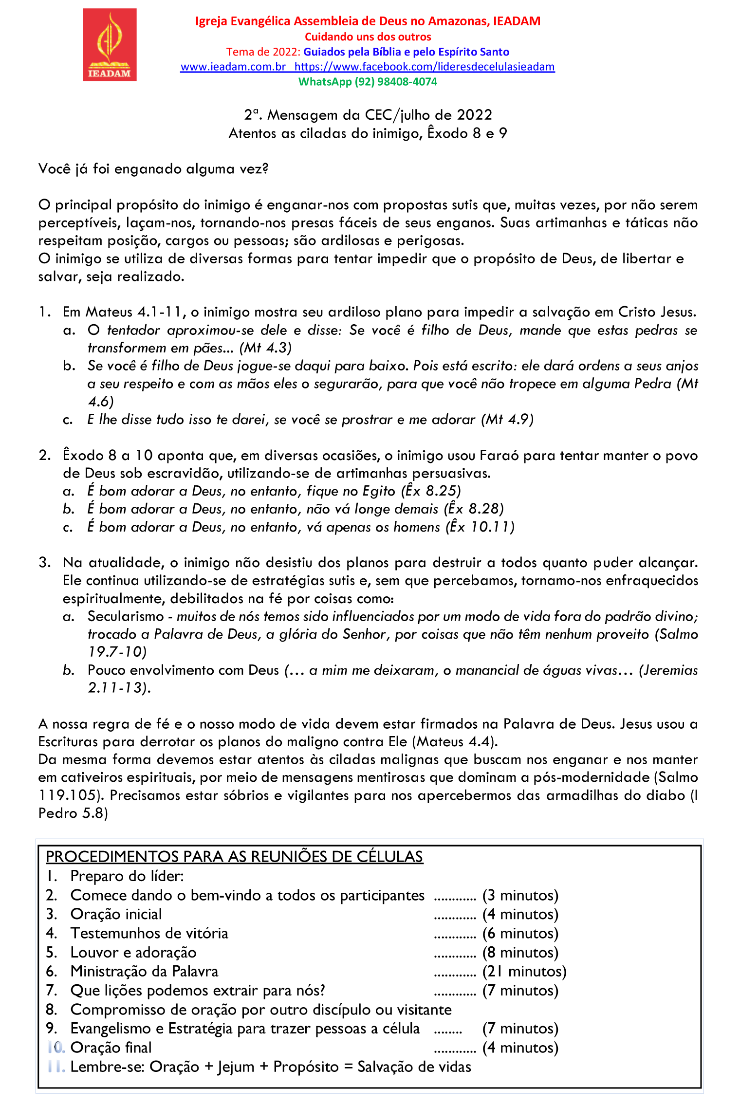 2ª. Mensagem da CEC/julho de 2022 Atentos as ciladas do inimigo, Êxodo 8 e 9