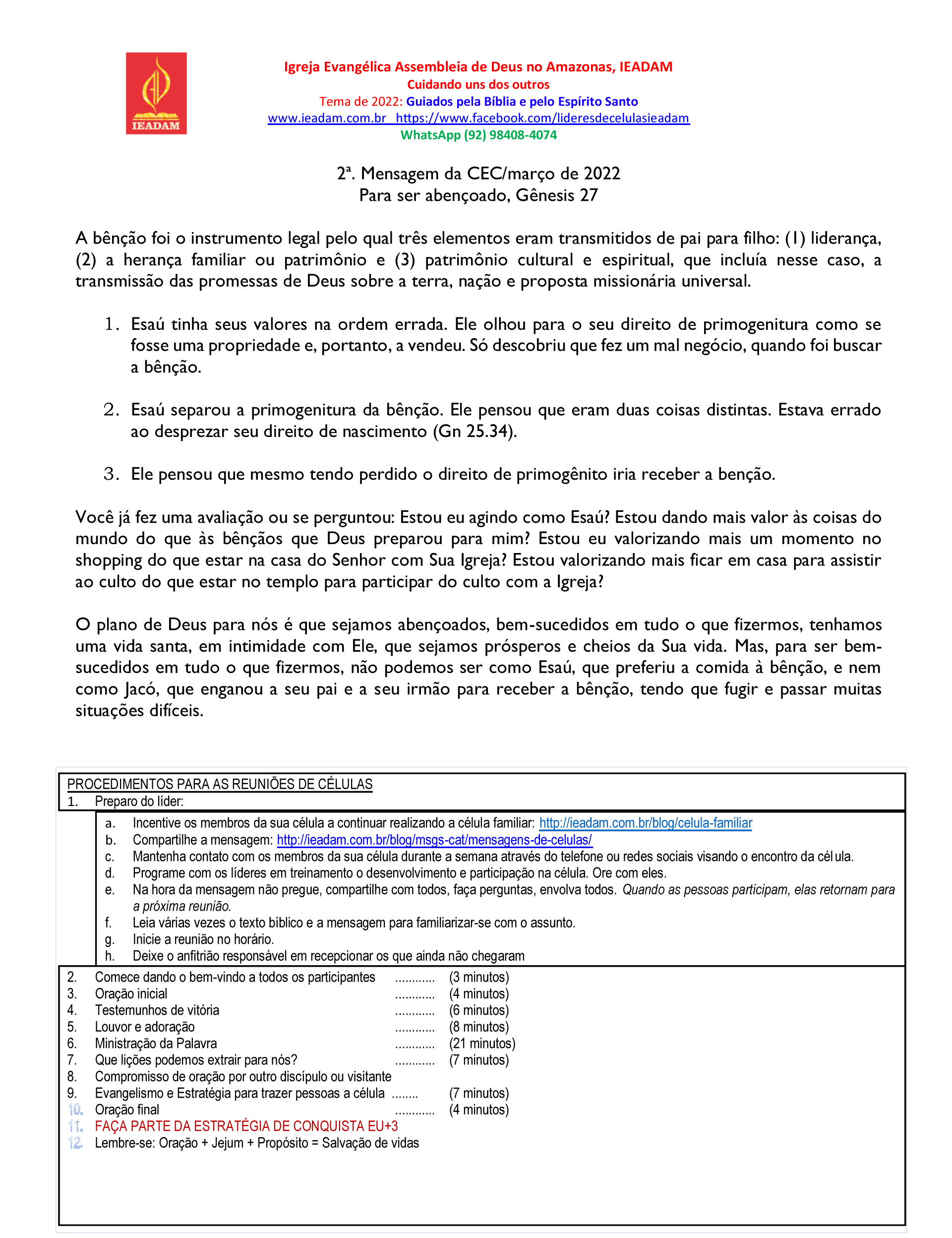 O plano de Deus para nós é que sejamos abençoados, bem-sucedidos em tudo o que fizermos, tenhamos uma vida santa, em intimidade com Ele, que sejamos prósperos e cheios da Sua vida. Mas, para ser bem-sucedidos em tudo o que fizermos, não podemos ser como Esaú, que preferiu a comida à bênção, e nem como Jacó, que enganou a seu pai e a seu irmão para receber a bênção, tendo que fugir e passar muitas situações difíceis.