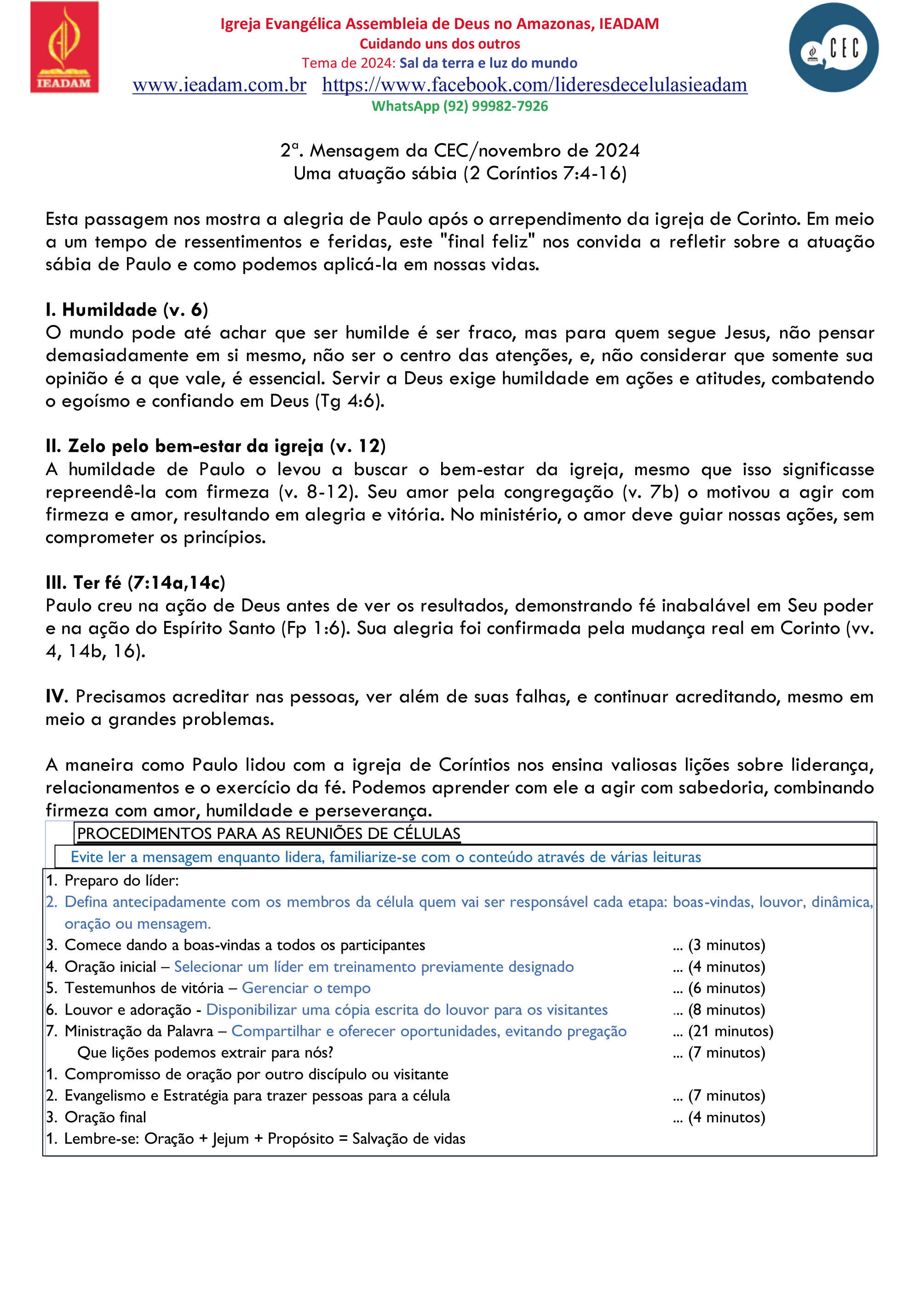 A humildade de Paulo o levou a buscar o bem-estar da igreja, mesmo que isso significasse repreendê-la com firmeza (v. 8-12). Seu amor pela congregação (v. 7b) o motivou a agir com firmeza e amor, resultando em alegria e vitória. No ministério, o amor deve guiar nossas ações, sem comprometer os princípios.