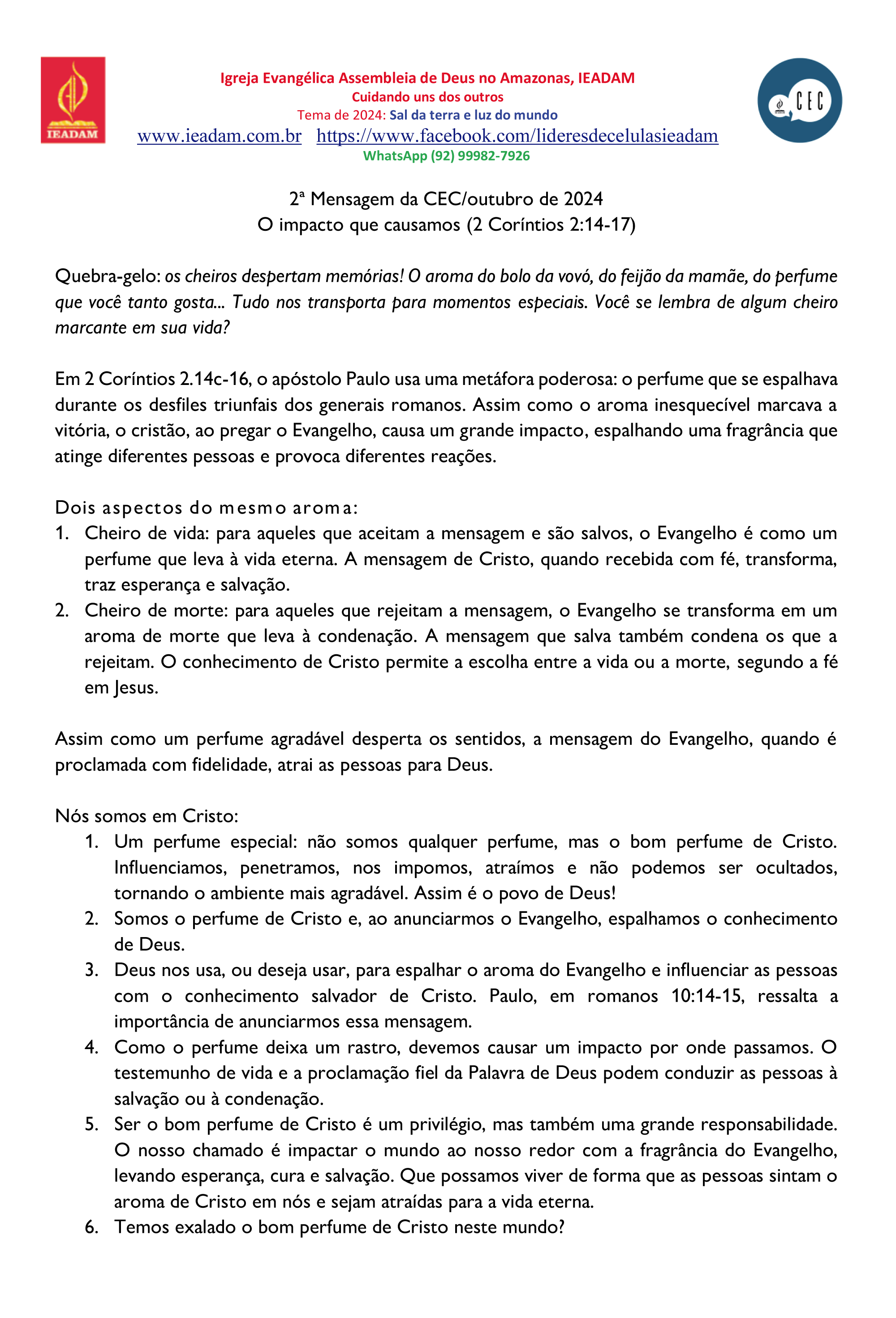 - Como o perfume deixa um rastro, devemos causar um impacto por onde passamos. O testemunho de vida e a proclamação fiel da Palavra de Deus podem conduzir as pessoas à salvação ou à condenação.
