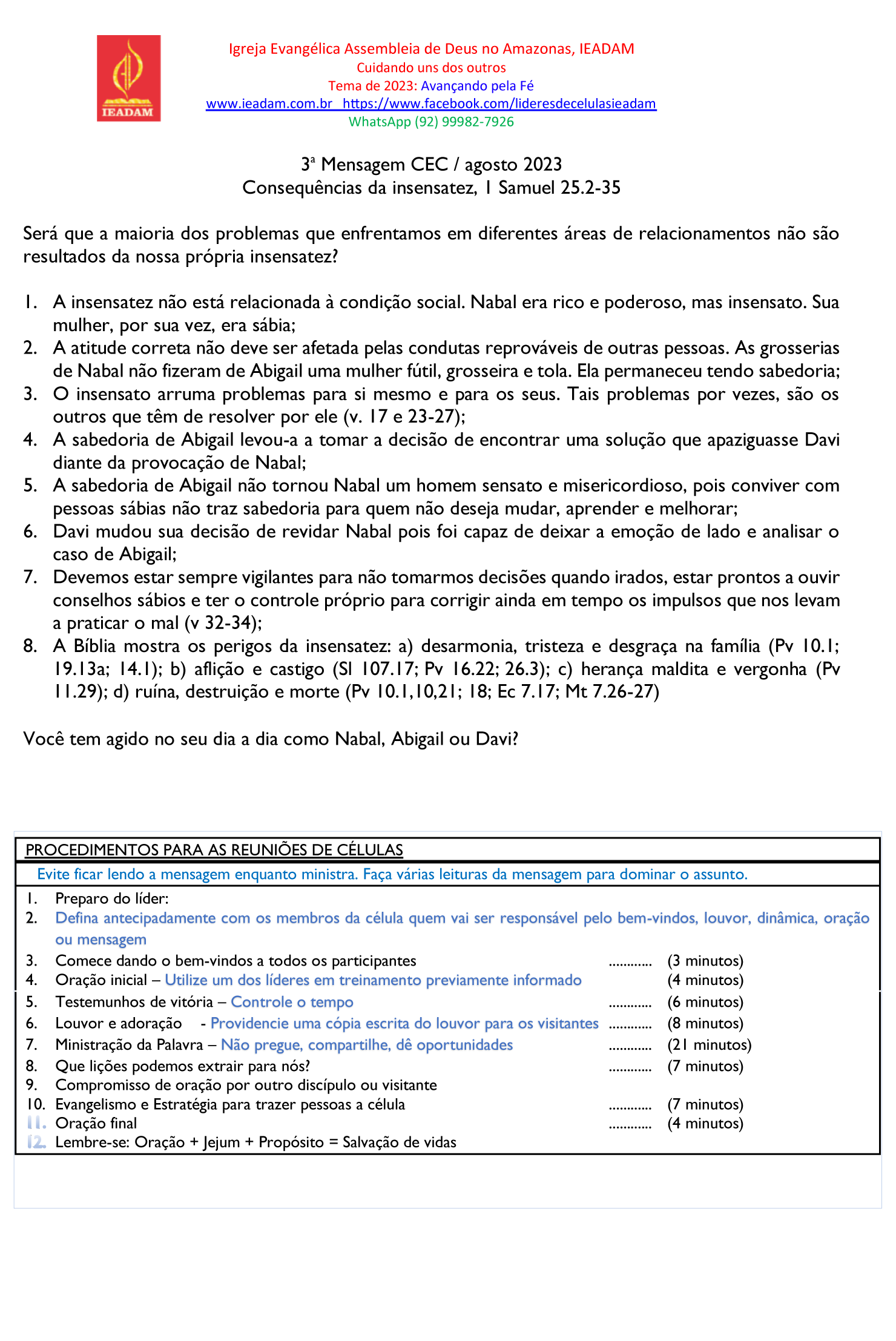 8. A Bíblia mostra os perigos da insensatez: a) desarmonia, tristeza e desgraça na família (Pv 10.1; 19.13a; 14.1); b) aflição e castigo (Sl 107.17; Pv 16.22; 26.3); c) herança maldita e vergonha (Pv 11.29); d) ruína, destruição e morte (Pv 10.1,10,21; 18; Ec 7.17; Mt 7.26-27)