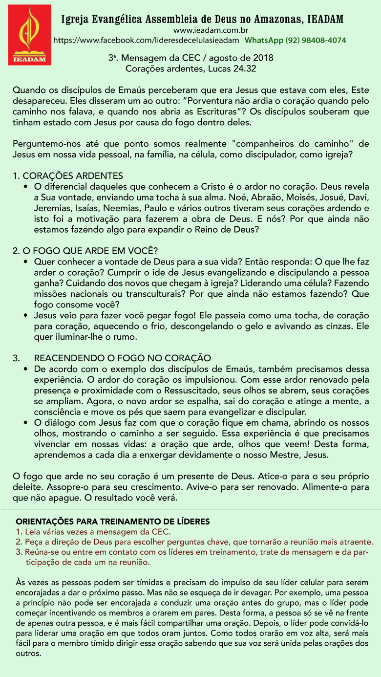 - Quer conhecer a vontade de Deus para a sua vida? Então responda: O que lhe faz arder o coração? Cumprir o ide de Jesus evangelizando e discipulando a pessoa ganha? Cuidando dos novos que chegam à igreja? Liderando uma célula? Fazendo missões nacionais ou transculturais? Por que ainda não estamos fazendo? Que fogo consome você?