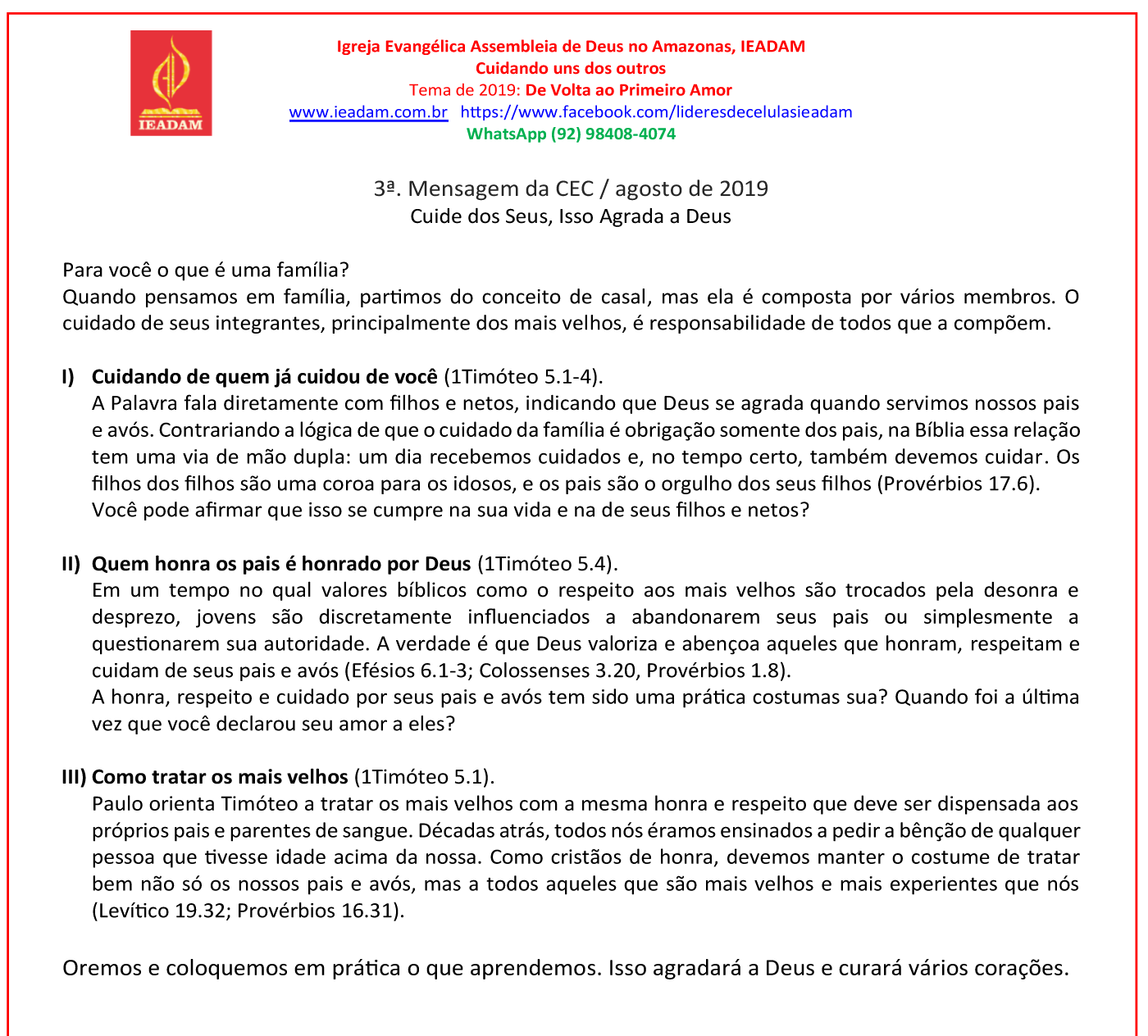 A Palavra fala diretamente com filhos e netos, indicando que Deus se agrada quando servimos nossos pais e avós. Contrariando a lógica de que o cuidado da família é obrigação somente dos pais, na Bíblia essa relação tem uma via de mão dupla: um dia recebemos cuidados e, no tempo certo, também devemos cuidar. Os filhos dos filhos são uma coroa para os idosos, e os pais são o orgulho dos seus filhos (Provérbios 17.6).