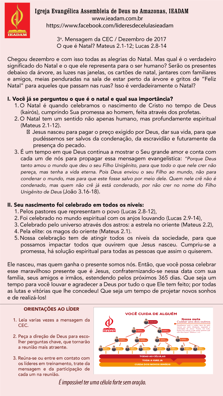 Muito maravilhosa essa mensagem outrora eu não tinha conhecimento do que essa data representava na minha vida mas há 3 anos que entreguei minha vida pra Cristo tudo mudou e só agradeço a Jesus Cristo por ter morrido e ressuscitou pra me dar vida e em abundância.tenham um feliz Natal e que Deus continue abençoando nossa célula igreja e cada ministério. A paz do senhor Jesus Cristo.