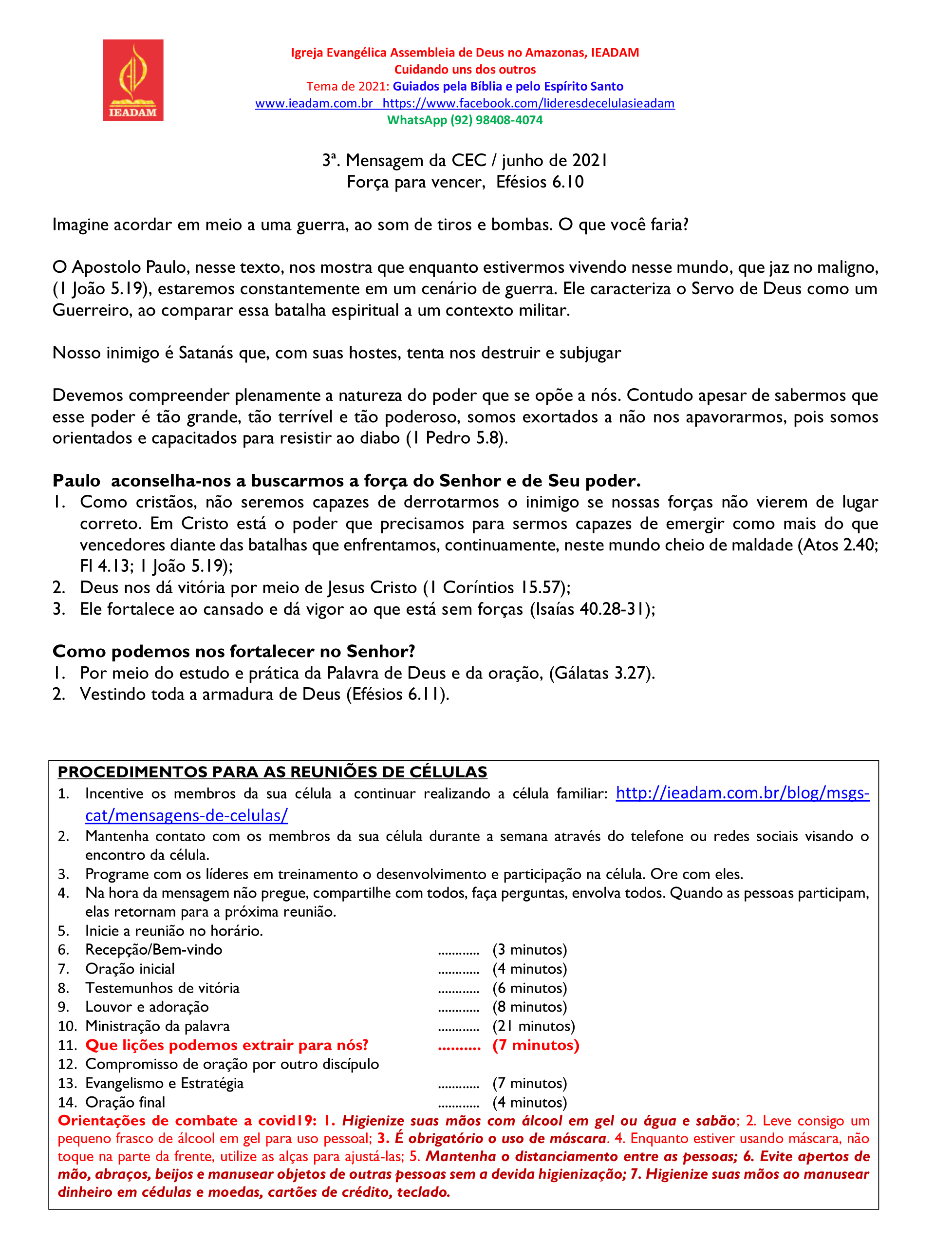 3ª. Mensagem da CEC / junho de 2021 Força para vencer,  Efésios 6.10