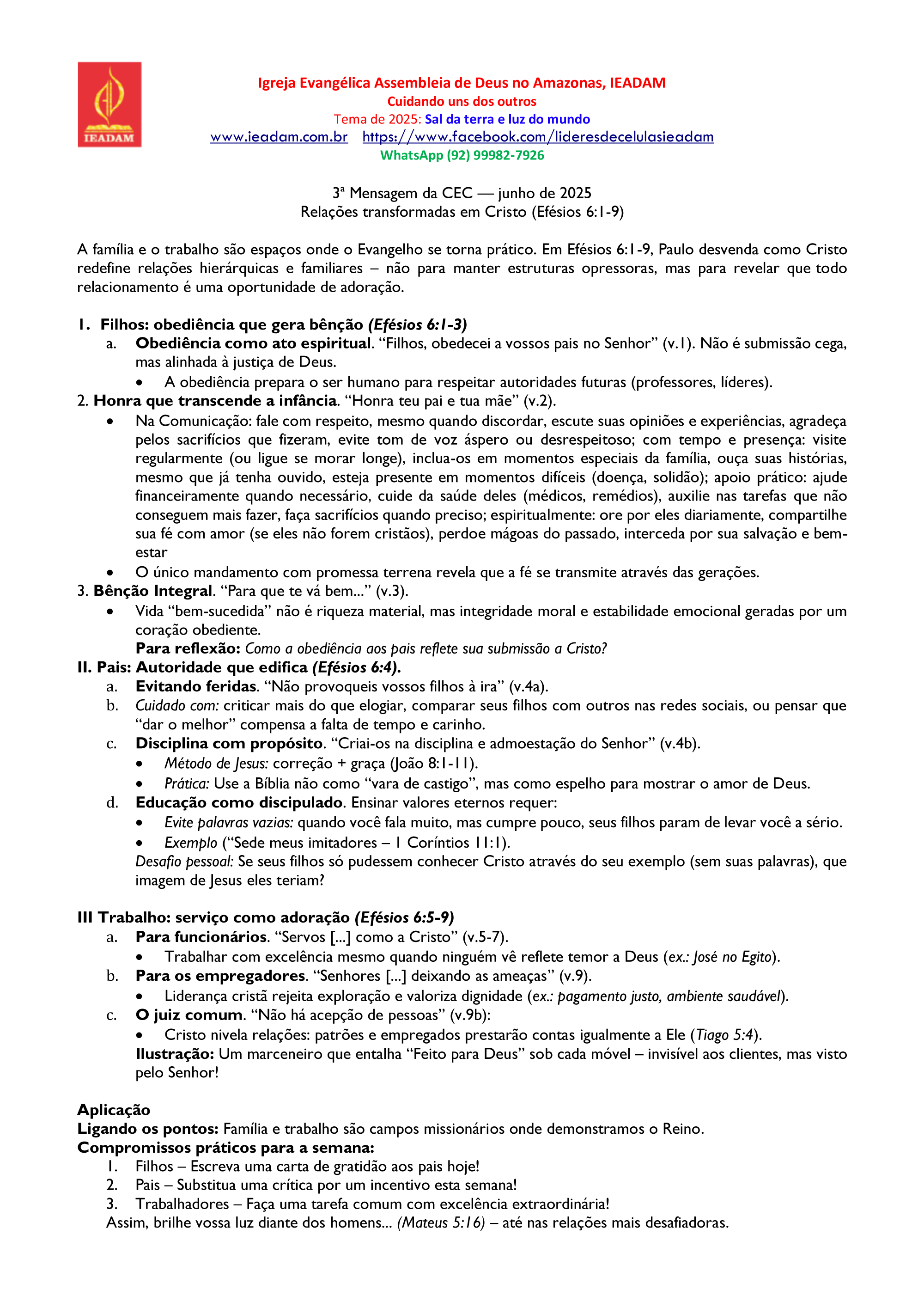 A família e o trabalho são espaços onde o Evangelho se torna prático. Em Efésios 6:1-9, Paulo desvenda como Cristo redefine relações hierárquicas e familiares – não para manter estruturas opressoras, mas para revelar que todo relacionamento é uma oportunidade de adoração.