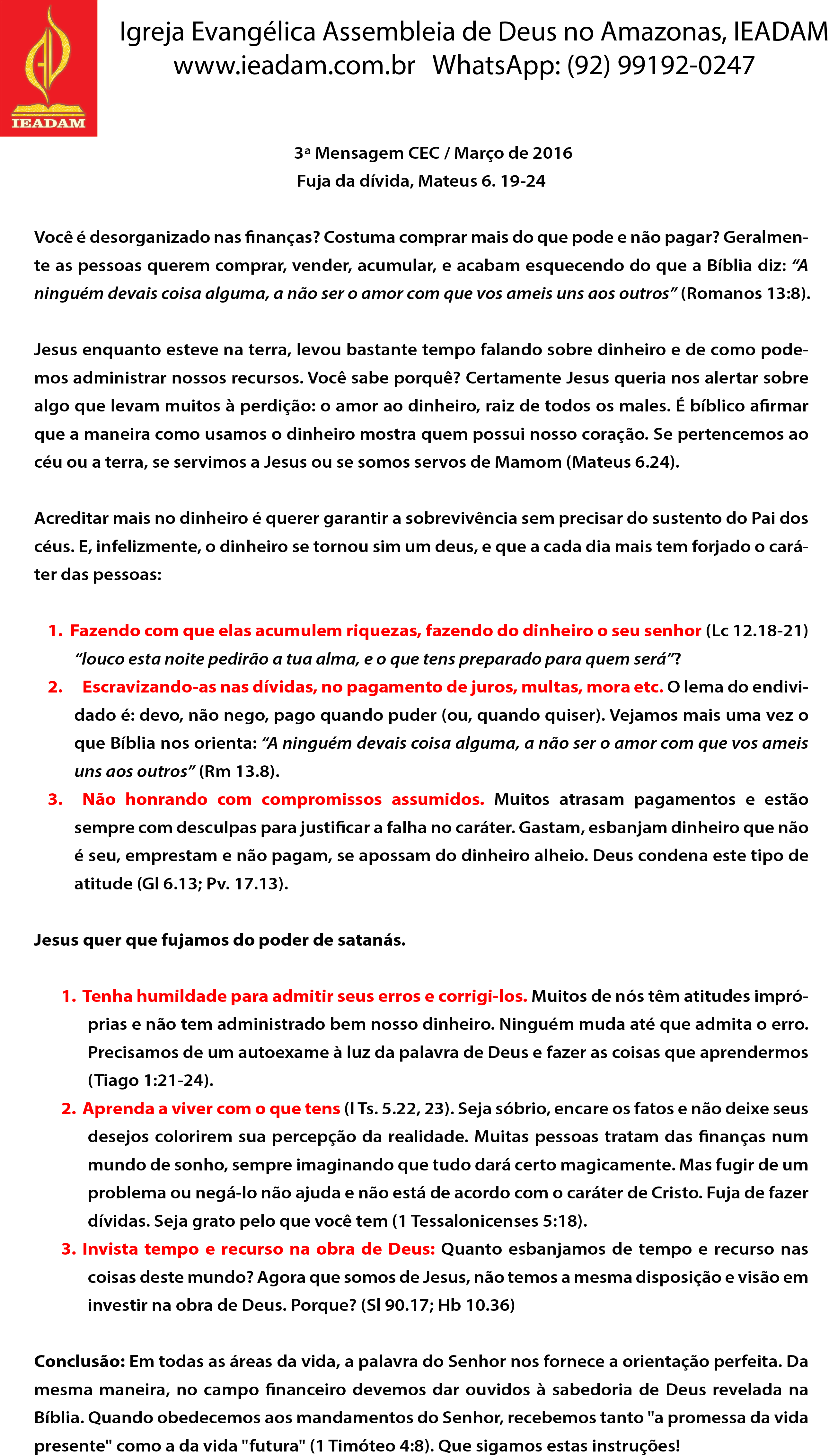 2. Escravizando-as nas dívidas, no pagamento de juros, multas, mora etc. O lema do endividado é: devo, não nego, pago quando puder (ou, quando quiser). Vejamos mais uma vez o que Bíblia nos orienta: “Não deveis coisa alguma a ninguém a não ser o amor” (Rm 13.8).