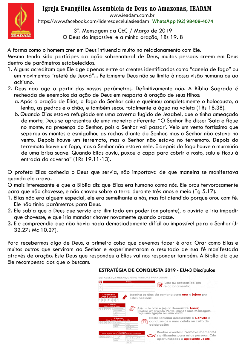 3ª. Mensagem da CEC / Março de 2019 O Deus do impossível e a minha oração, 1 Rs 19. 8