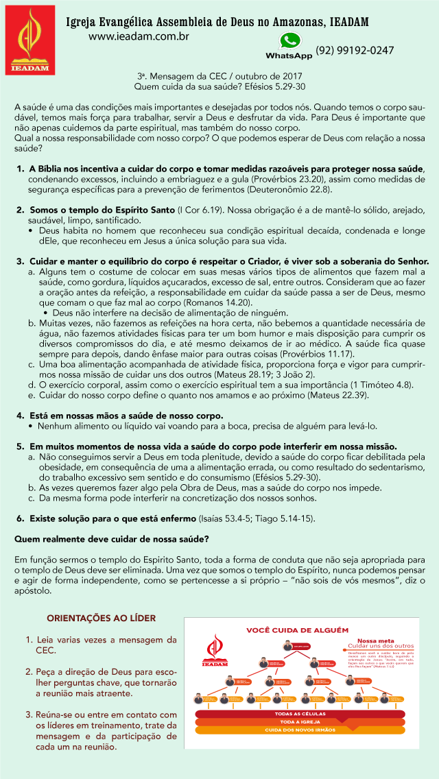c. Uma boa alimentação acompanhada de atividade física, proporciona força e vigor para cumprirmos nossa missão de cuidar uns dos outros (Mateus 28.19; 3 João 2).