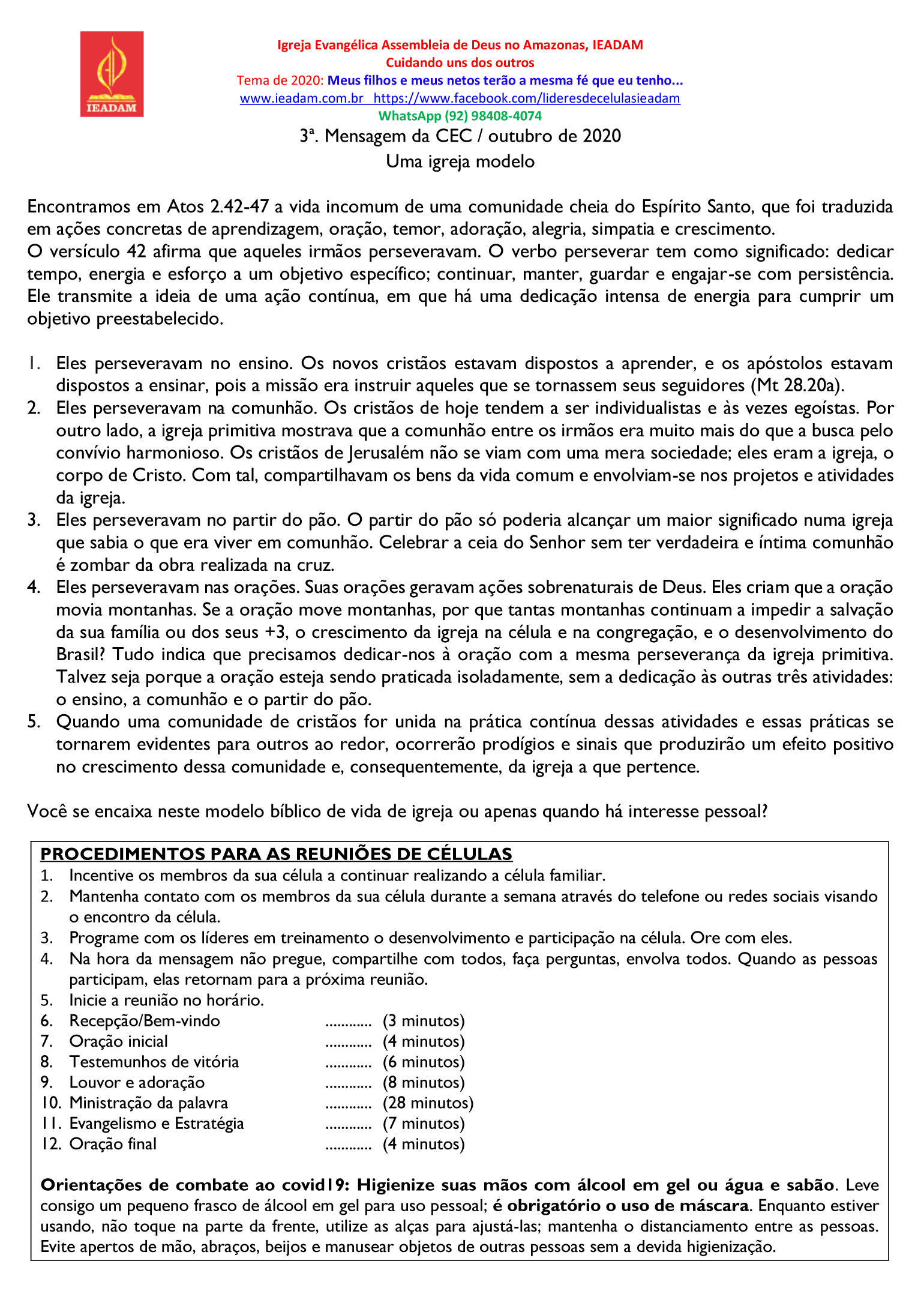 3ª. Mensagem da CEC / outubro de 2020 Uma igreja modelo
