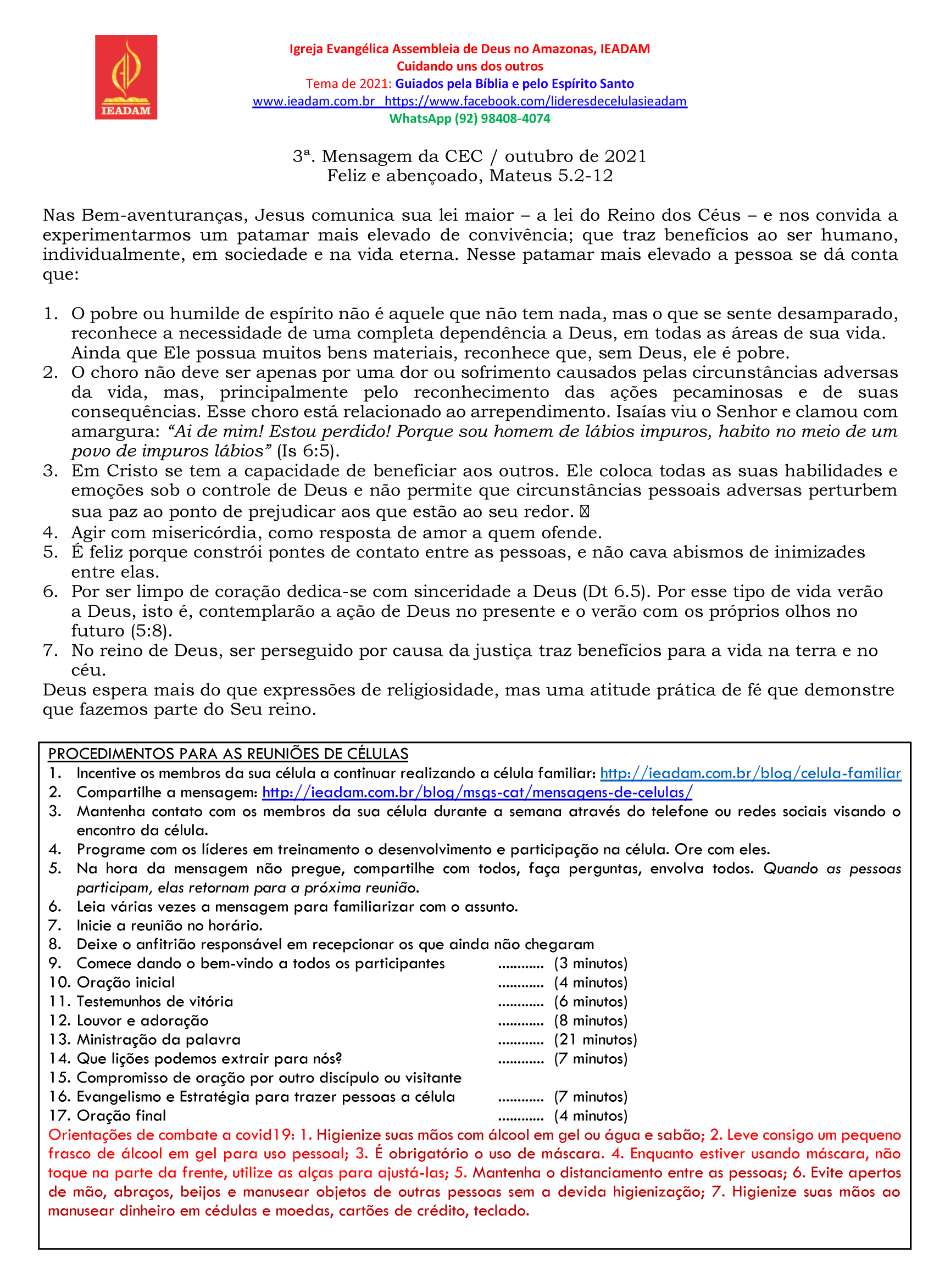 PROCEDIMENTOS PARA AS REUNIÕES DE CÉLULAS