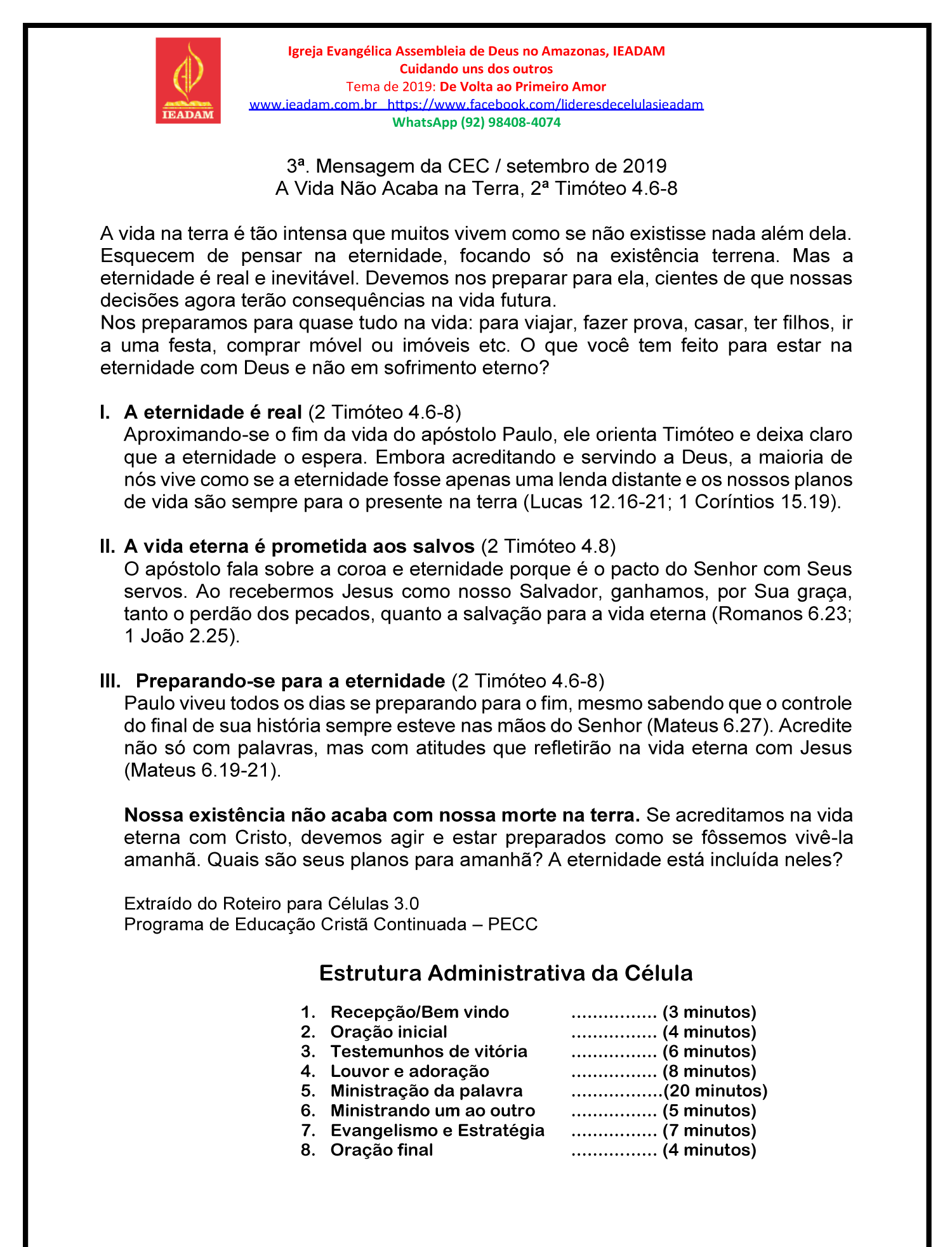 Aproximando-se o fim da vida do apóstolo Paulo, ele orienta Timóteo e deixa claro que a eternidade o espera. Embora acreditando e servindo a Deus, a maioria de nós vive como se a eternidade fosse apenas uma lenda distante e os nossos planos de vida são sempre para o presente na terra (Lucas 12.16-21; 1 Coríntios 15.19).