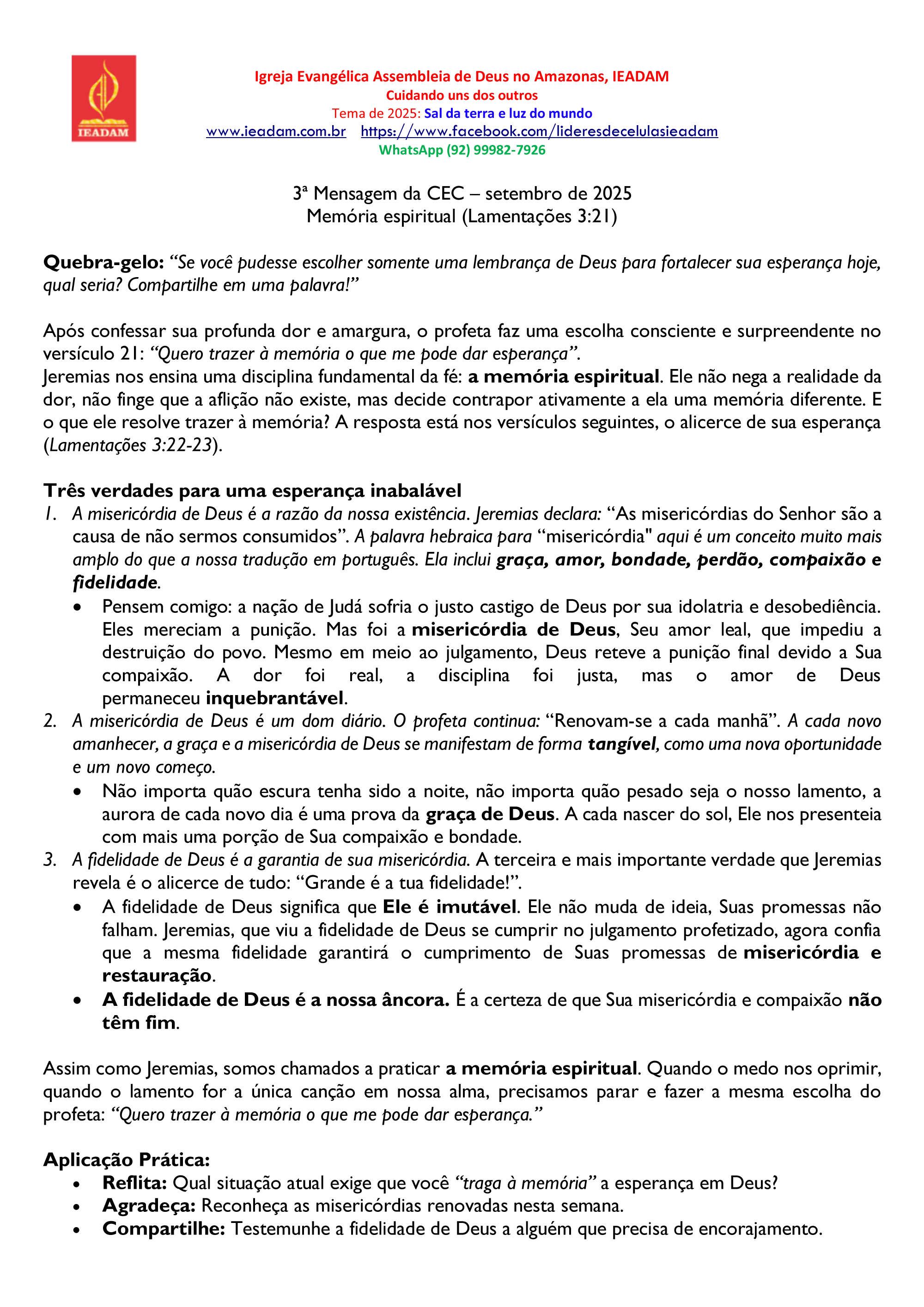 Assim como Jeremias, somos chamados a praticar a memória espiritual. Quando o medo nos oprimir, quando o lamento for a única canção em nossa alma, precisamos parar e fazer a mesma escolha do profeta: “Quero trazer à memória o que me pode dar esperança.”