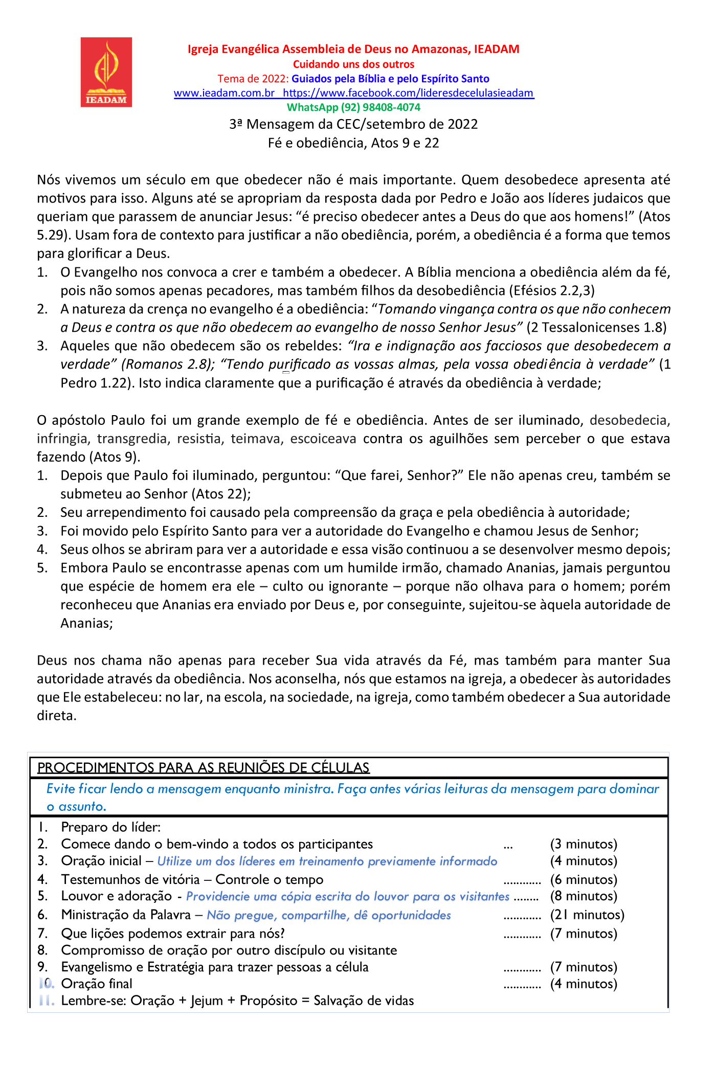 PROCEDIMENTOS PARA AS REUNIÕES DE CÉLULAS