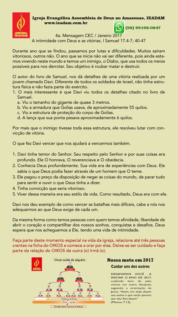 4a. Mensagem CEC / Janeiro 2017 A intimidade com Deus e as vitórias, I Samuel 17.4-7; 40-47
