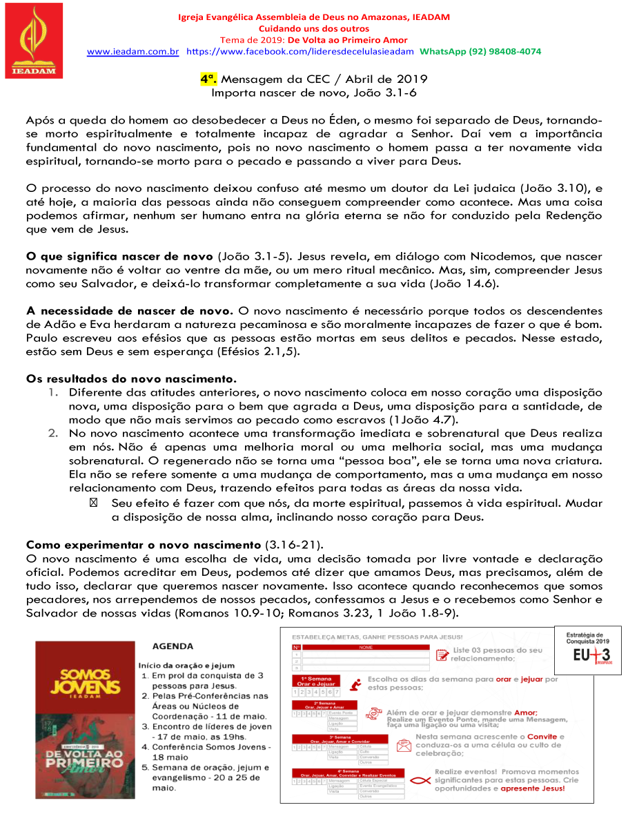 O que significa nascer de novo(João 3.1-5). Jesus revela, em diálogo com Nicodemos, que nascer novamente não é voltar ao ventre da mãe, ou um mero ritual mecânico. Mas, sim, compreender Jesus como seu Salvador, e deixá-lo transformar completamente a sua vida (João 14.6).