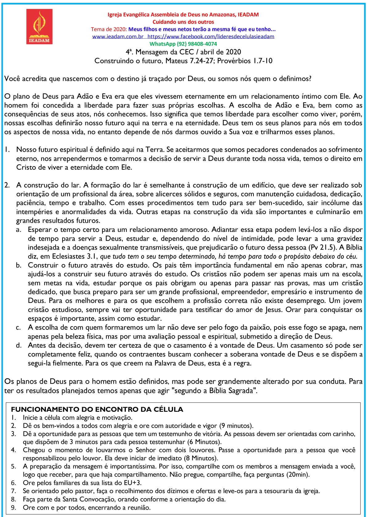 5. A preparação da mensagem é importantíssima. Por isso, compartilhe com os membros a mensagem enviada a você, logo que receber, para que haja compartilhamento. Não pregue, compartilhe, faça perguntas (20min).
