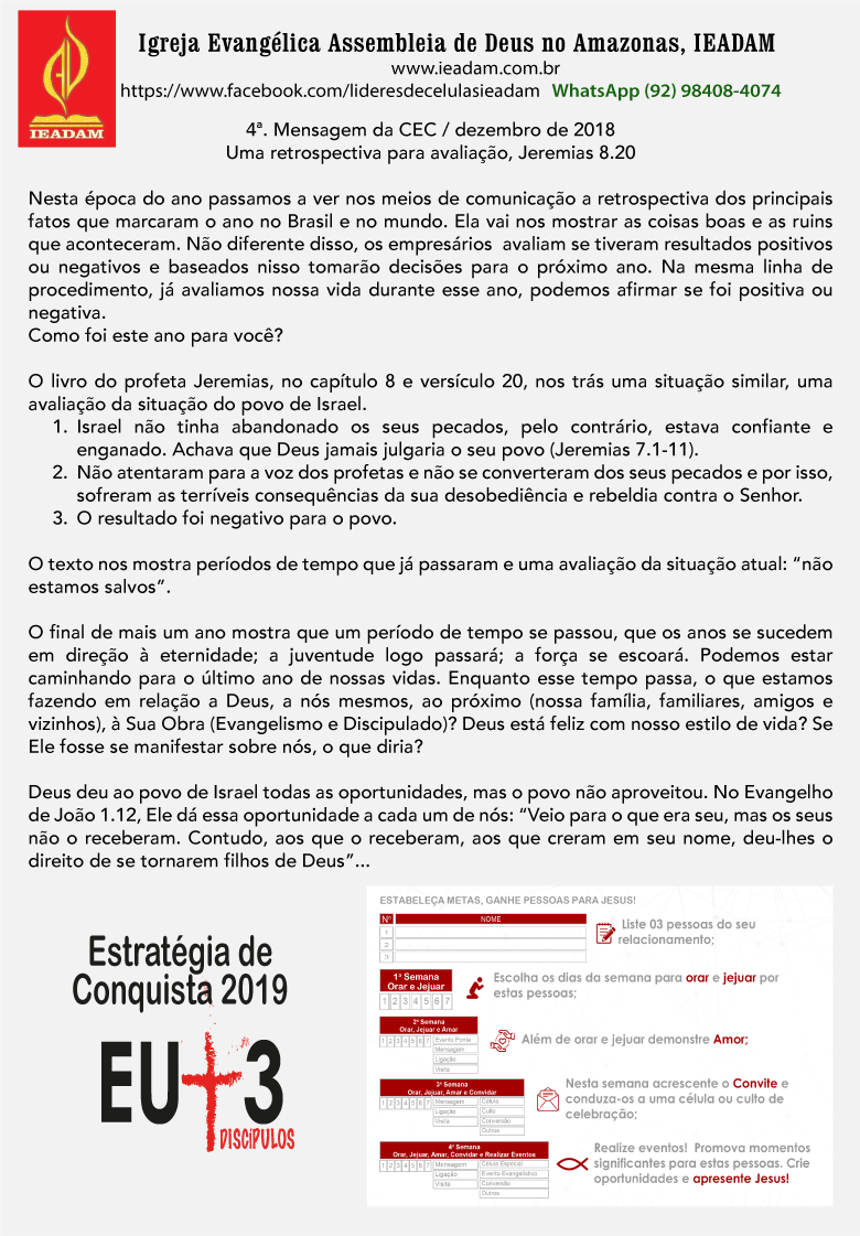 O final de mais um ano mostra queum período de tempo se passou, que os anos se sucedem em direção à eternidade; a juventude logo passará; a forçase escoará. Podemos estar caminhando parao último ano de nossasvidas.Enquanto esse tempo passa, o que estamos fazendo em relação a Deus, a nós mesmos, ao próximo (nossa família, familiares, amigos e vizinhos), à Sua Obra (Evangelismo e Discipulado)? Deus está feliz com nosso estilo de vida? Se Ele fosse se manifestar sobre nós, o que diria?
