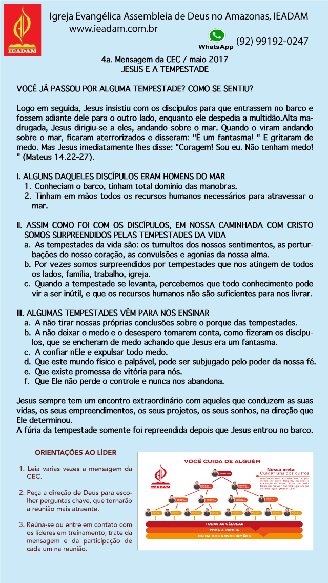 A fúria da tempestade somente foi repreendida depois que Jesus entrou no barco. Ele não vai operar um milagre em nossas tempestades, mas fará o seu poder entrar em ação dentro do barco da nossa vida.