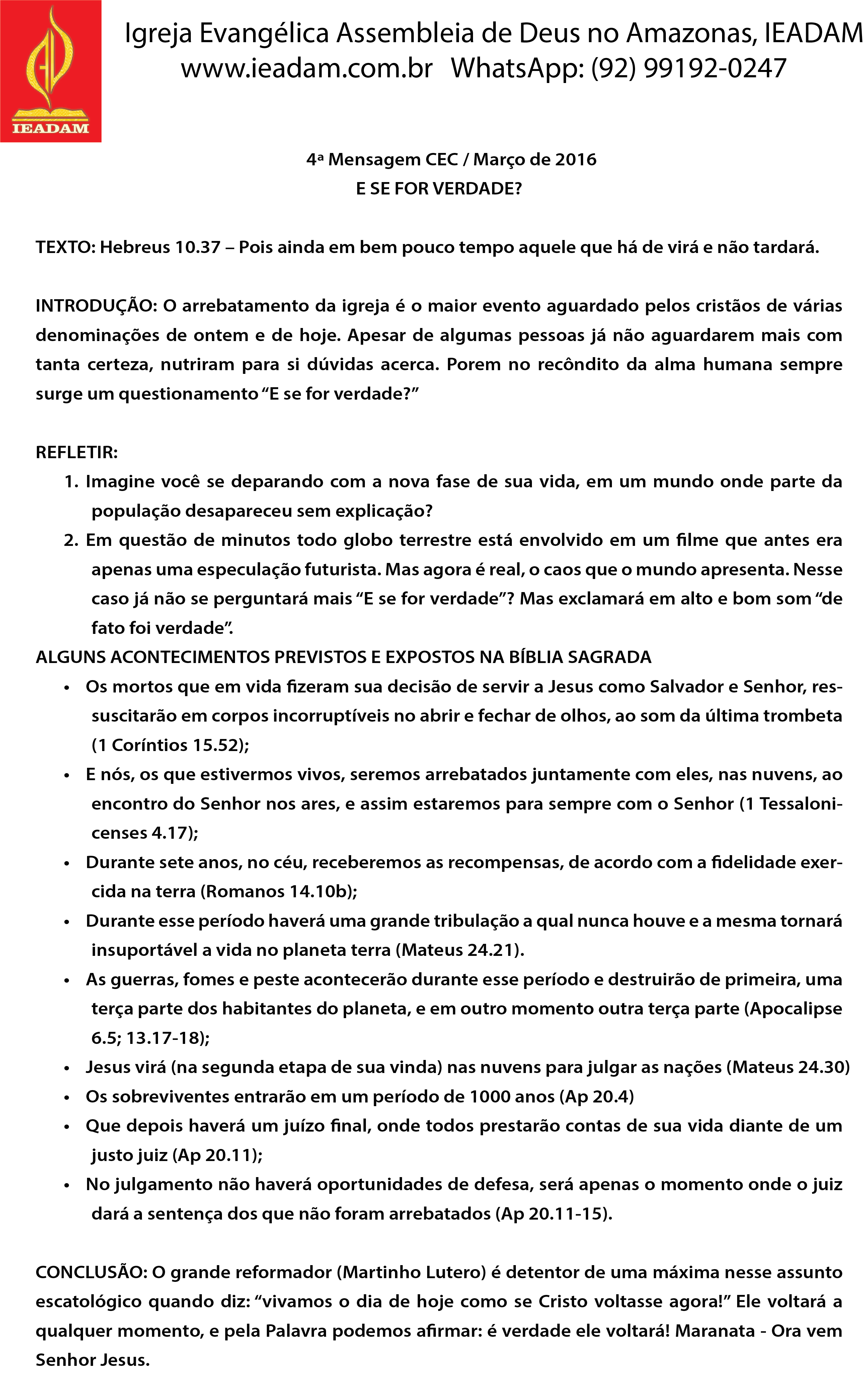 CONCLUSÃO: O grande reformador (Martinho Lutero) é detentor de uma máxima nesse assunto escatológico quando diz: “vivamos o dia de hoje como se Cristo voltasse agora!” Ele voltará a qualquer momento, e pela Palavra podemos afirmar: é verdade ele voltará! Maranata – Ora vem Senhor Jesus.