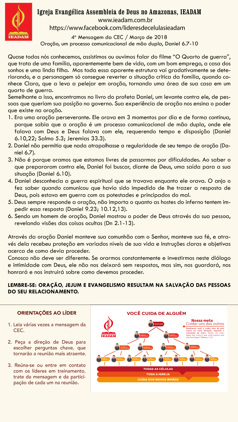 4ª. Mensagem da CEC / Março de 2018 Oração, um processo comunicacional de mão dupla, Daniel 6.7-10